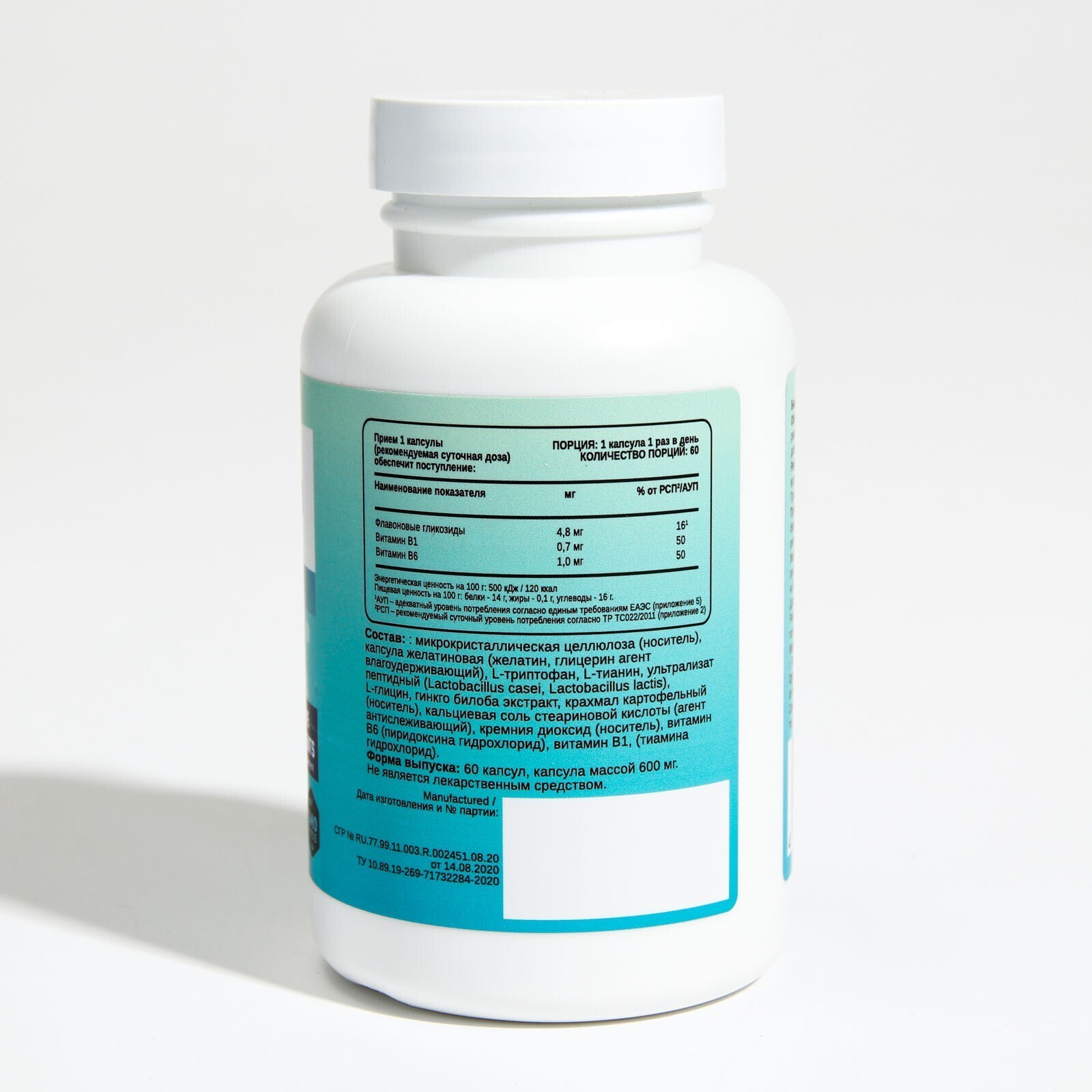 Состав: микрокристаллическая целлюлоза (носитель), капсула желатиновая (желатин, глицерин агент влагоудерживающий), L-триптофан, L-тианин, ультрализат пептидный (Lactobacillus casei, Lactobacillus lactis), L-глицин, гинкго билоба экстракт, крахмал картофельный (носитель), кальциевая соль стеариновой кислоты (агент антислеживающий), кремния диоксид (носитель), витамин В6 (пиридоксина гидрохлорид), витамин В1, (тиамина гидрохлорид).