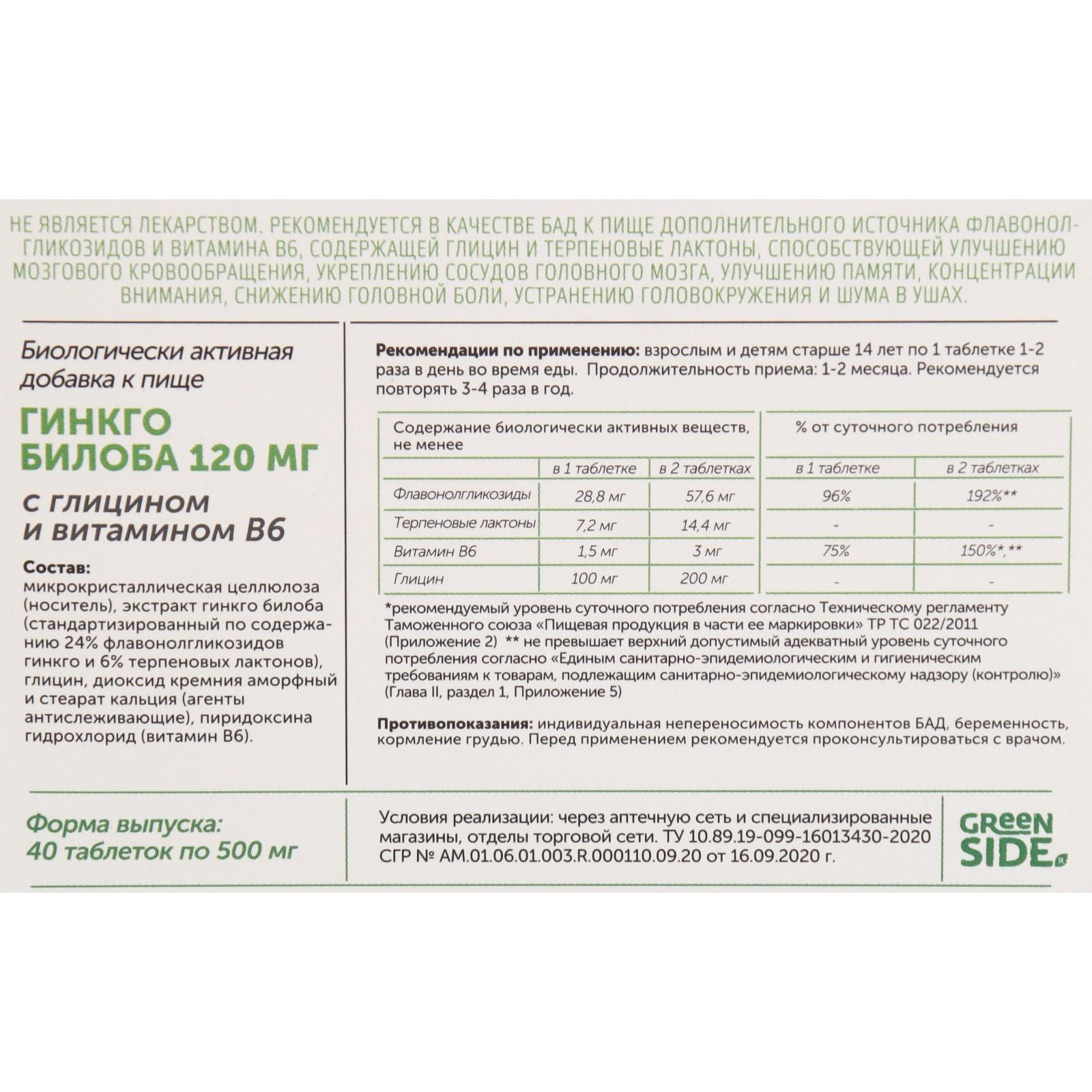 Глицин с витамином В6, гинкго билоба 120 мг 40 таблеток, 500 мг