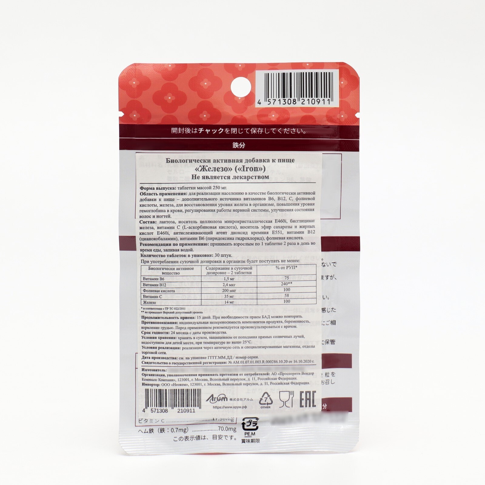 Комплекс витаминов японский B12, B6, С + железо + цинк, для работы нервной системы, 30 таблеток