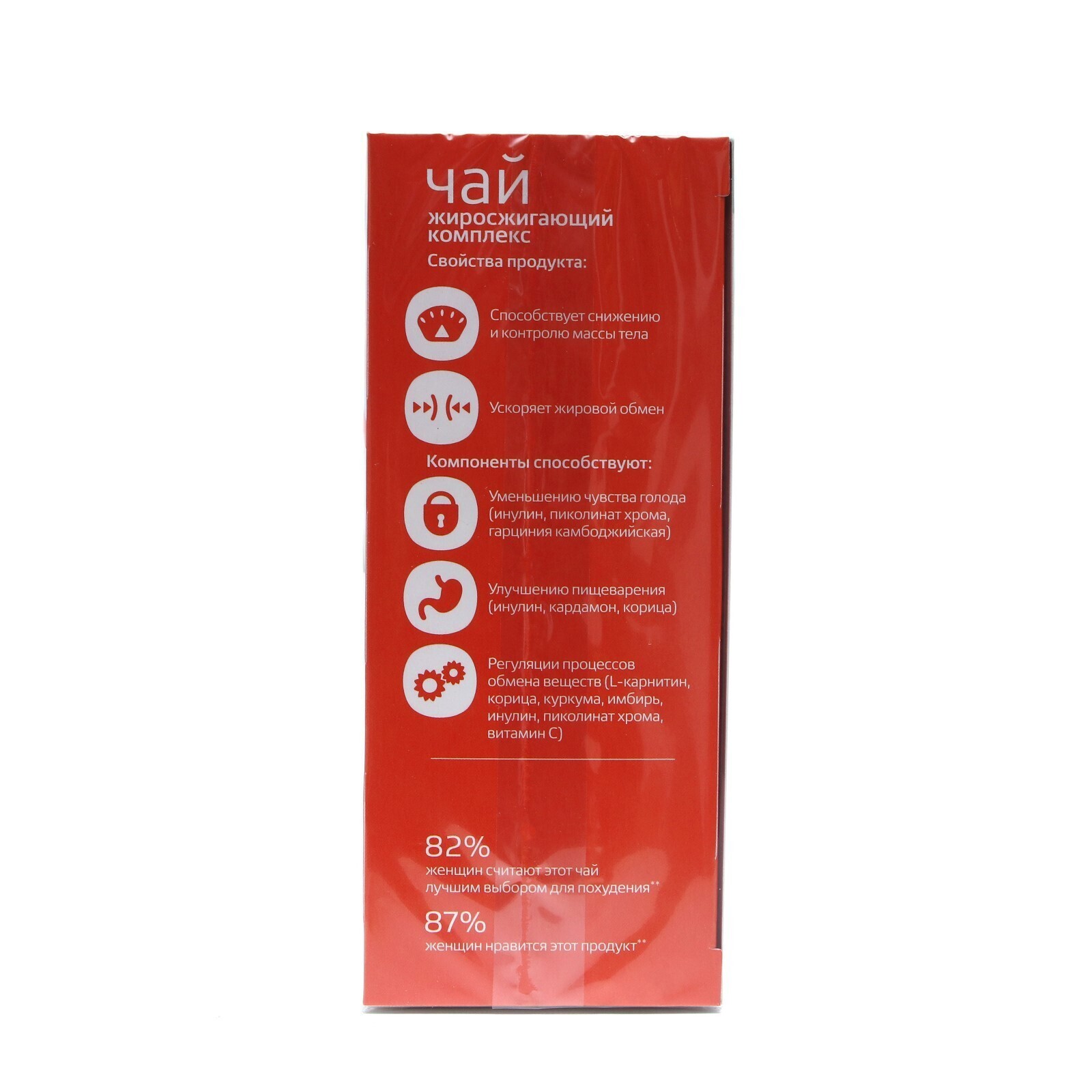 В составе чая для похудения эффективный жиросжигающий комплекс - инулин, витамин c, корица, l-карнитин, имбирь, кардамон, пиколинат хрома, куркума и экстракт плодов гарцинии камбоджийской. Он помогает быстрее и легче расставаться с лишними килограммами, регулировать обмен веществ, улучшать работу кишечника, снижать чувство голода и тягу к сладкому в течение всего дня.