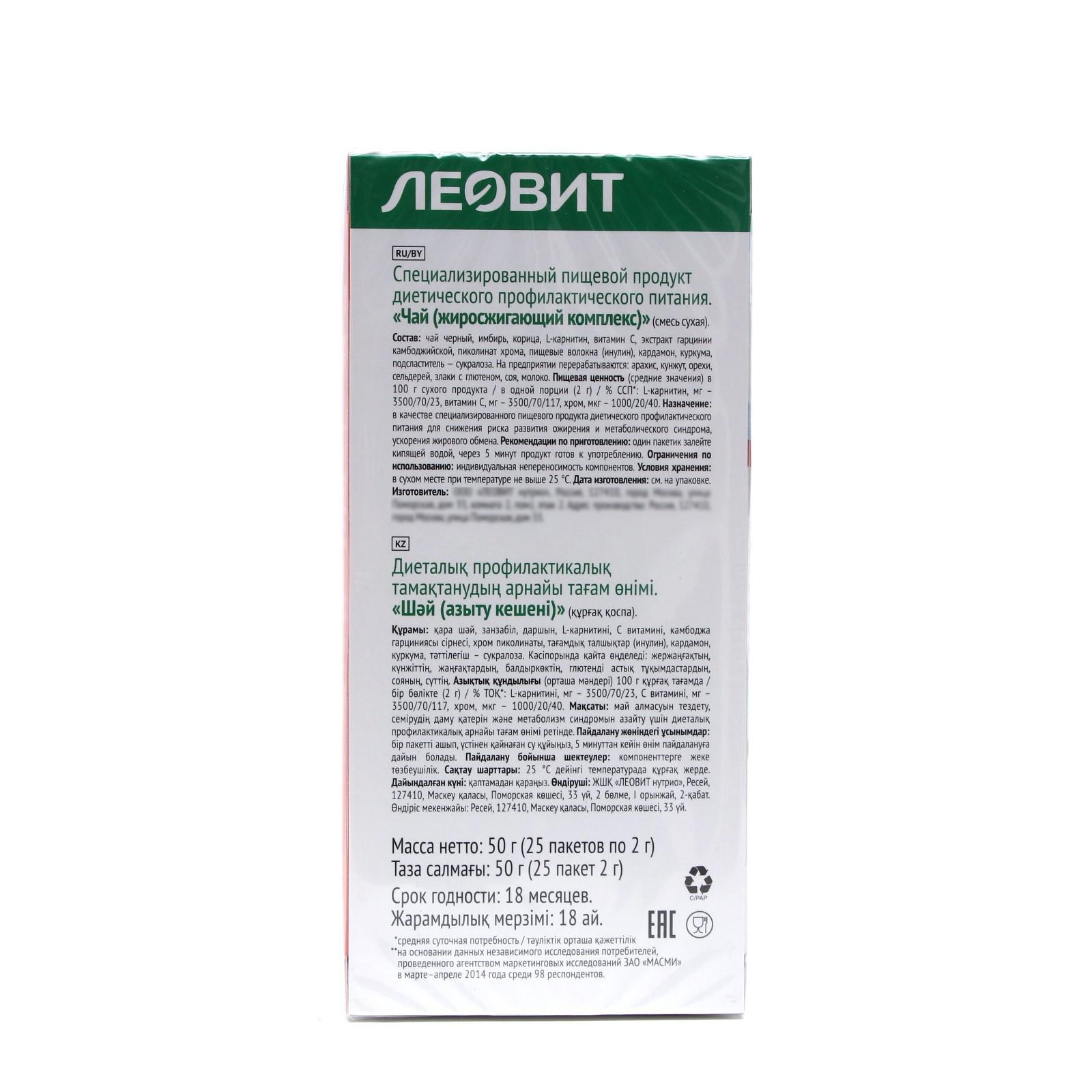 Назначение: в качестве специализированного пищевого продукта диетического профилактического питания для снижения риска развития ожирения и метаболического синдрома, ускорения жирового обмена.