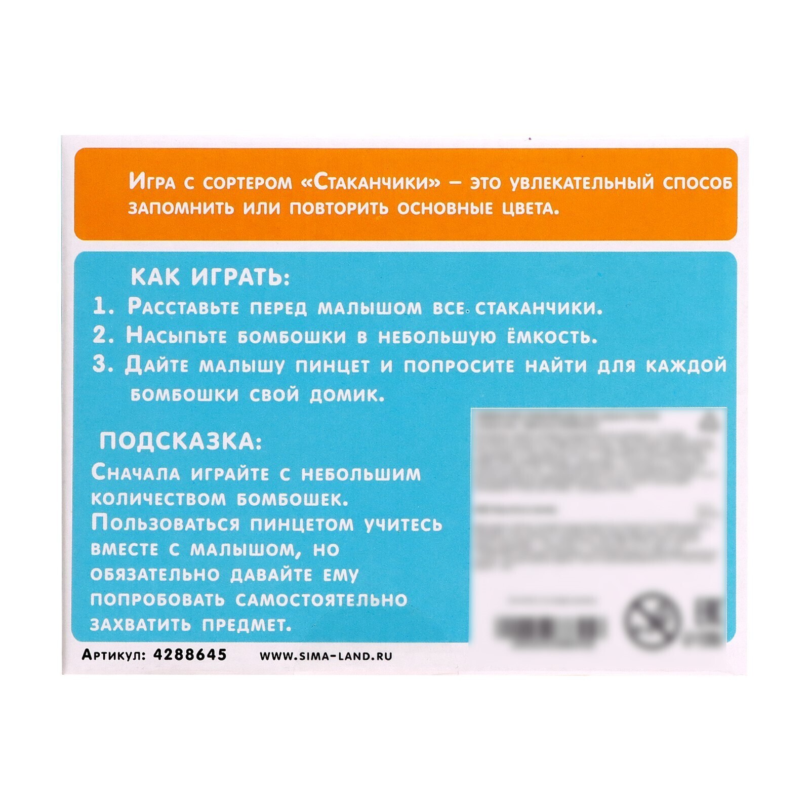Набор «Сортер-стаканчики: цветные бомбошки» рекомендован детям старше 3 лет. Играть следует под присмотром родителей.