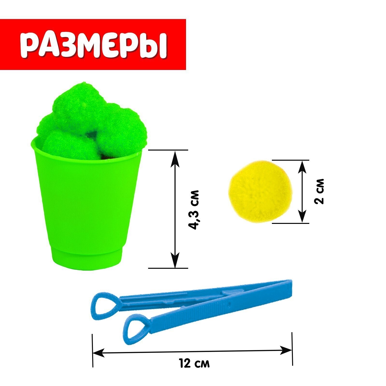В комплект входят 50 ярких шариков-бомбошек 5 цветов, 5 цветных стаканчиков и пинцет для сортировки.