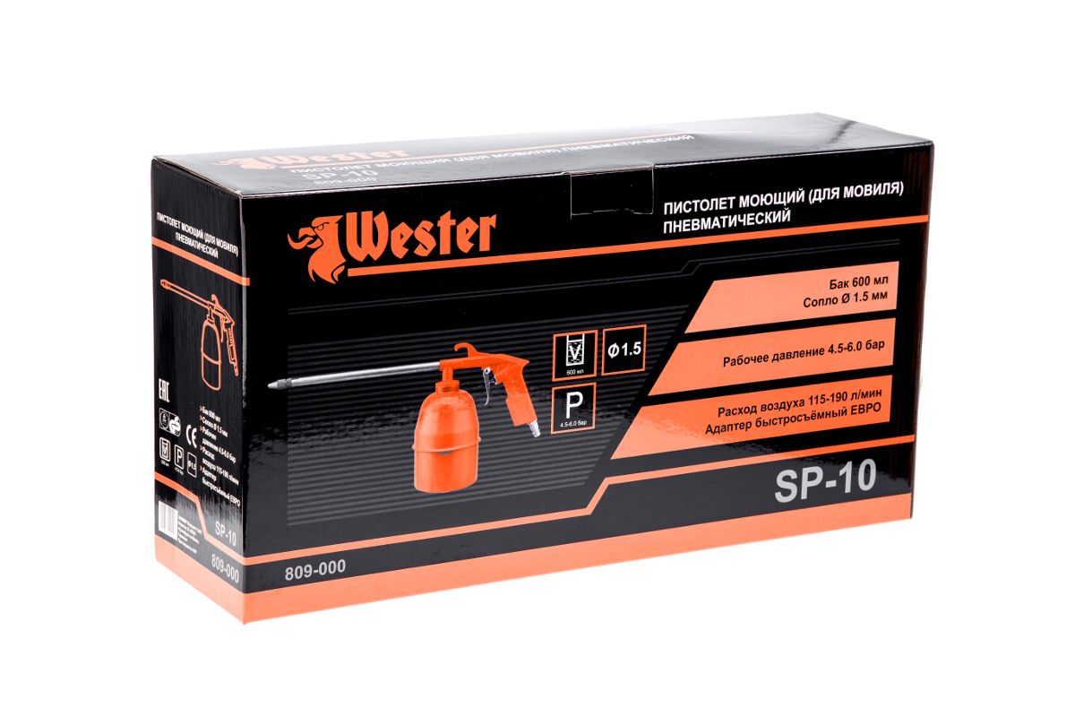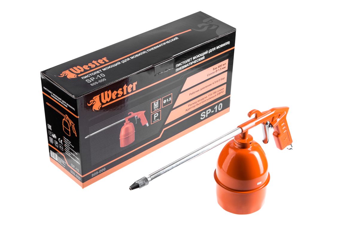 WESTER SP-10 – пневматический пистолет для покрытия автомобиля антикоррозийными, консервирующими или моющими составами. Выполнен из алюминия, лёгкий и устойчивый к коррозийному воздействию жидкостей. Диаметр сопла – 1,5 мм. Совместим с компрессорами производительностью от 115 л/мин.