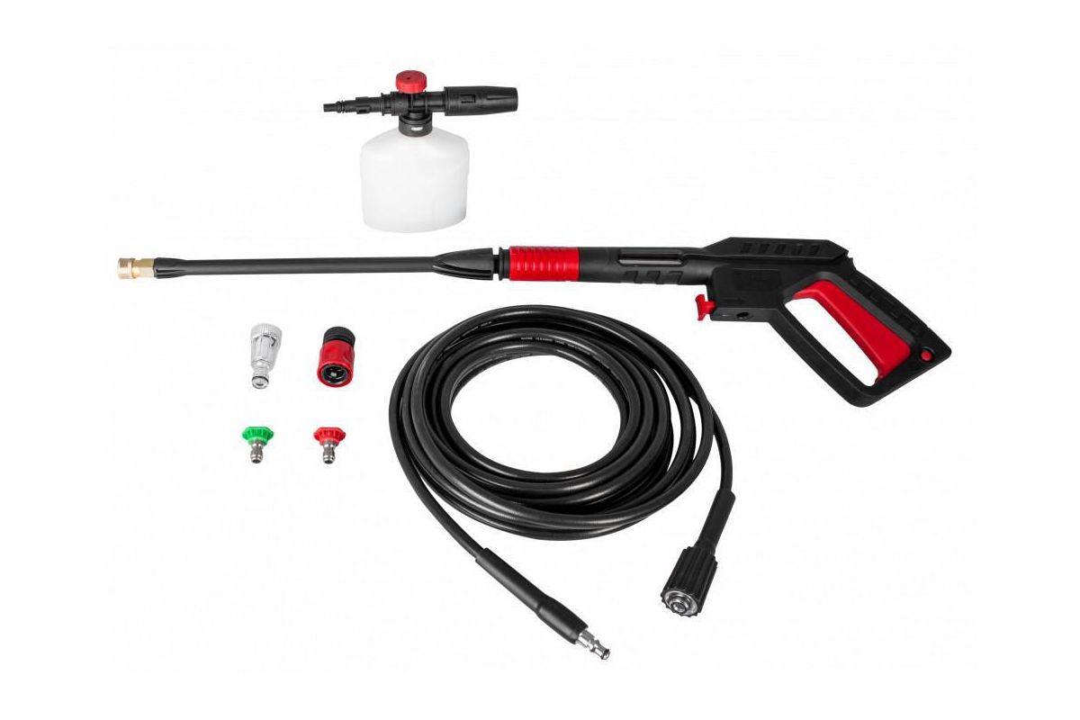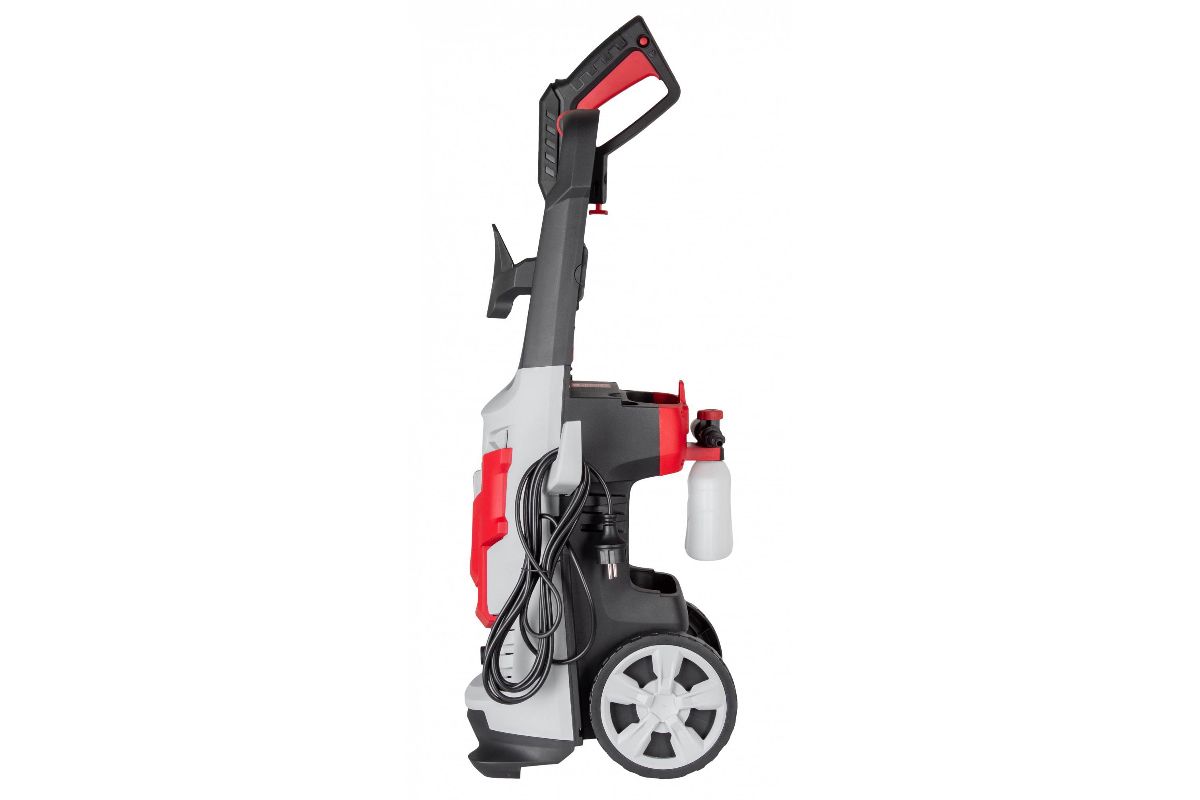 Мойка высокого давления для очистки садовых дорожек, автомобилей, фасадов зданий и других поверхностей. Имеет держатель для пистолета, обеспечивающий компактное хранение. Для быстрого перемещения по территории оснащена колесами и рукояткой.