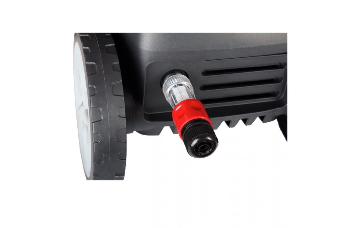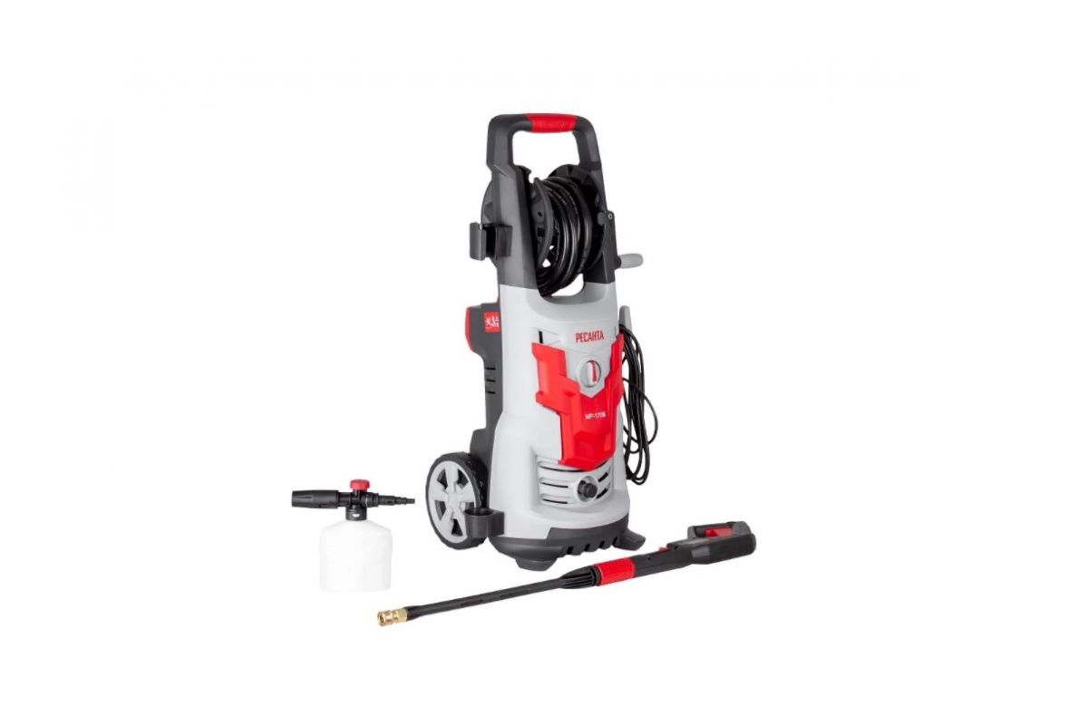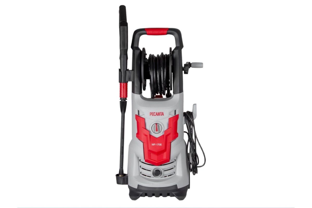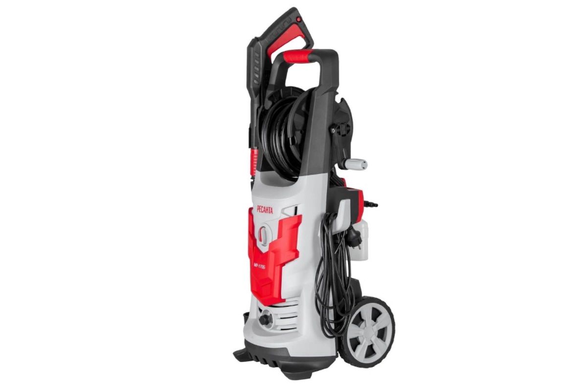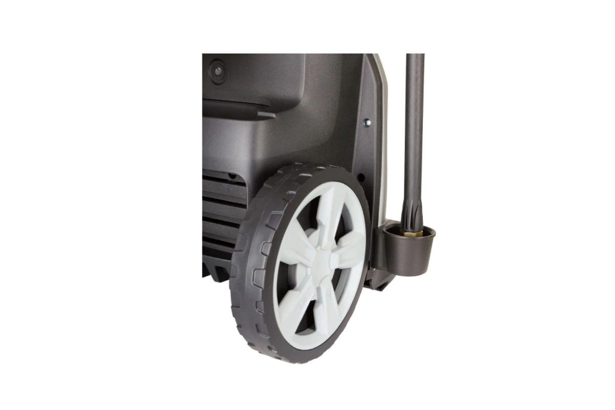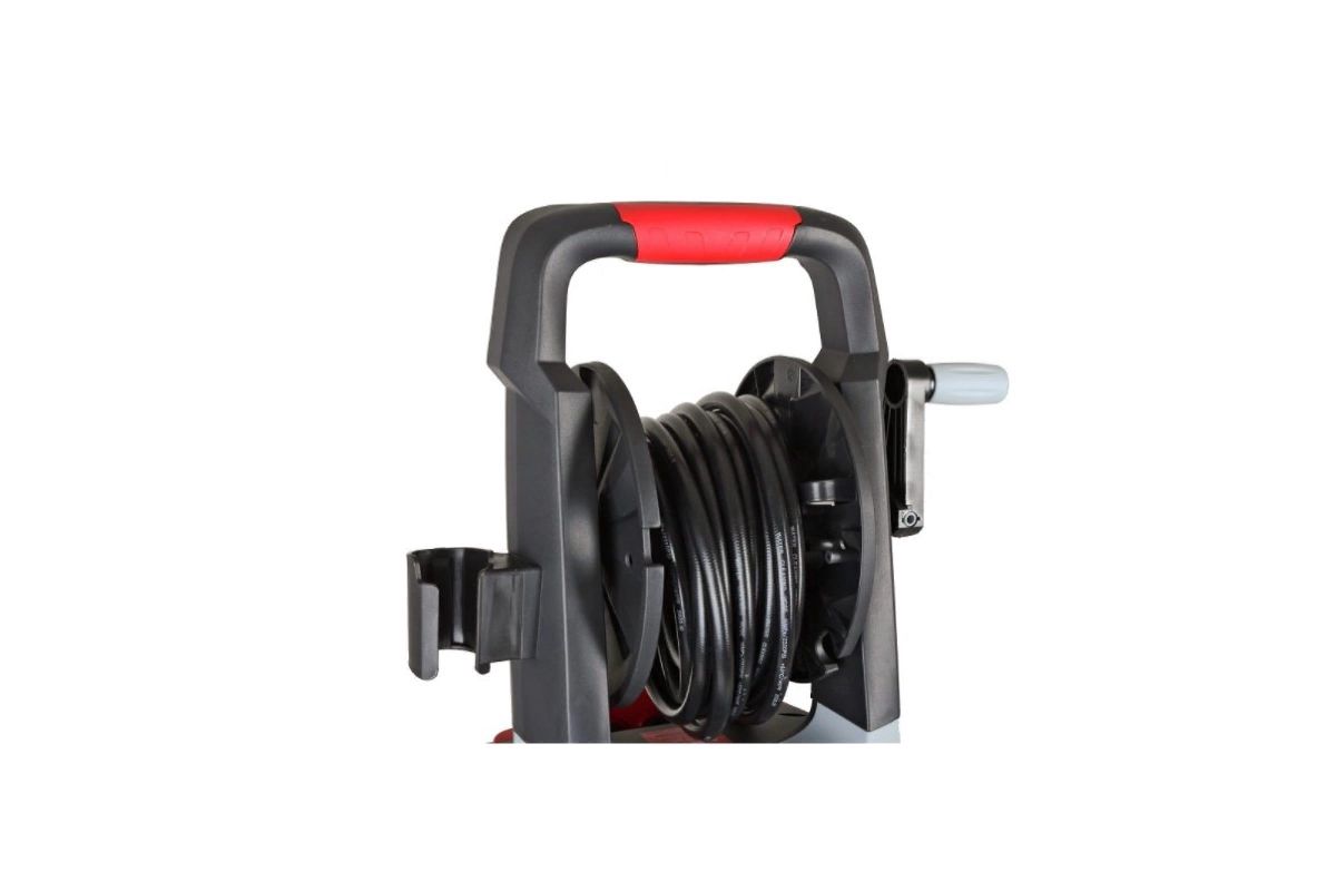 Мойка высокого давления для очистки садовых дорожек, автомобилей, фасадов зданий и других поверхностей. Имеет держатель для пистолета, обеспечивающий компактное хранение и барабан для намотки шланга. Для быстрого перемещения по территории оснащена колесами и рукояткой.