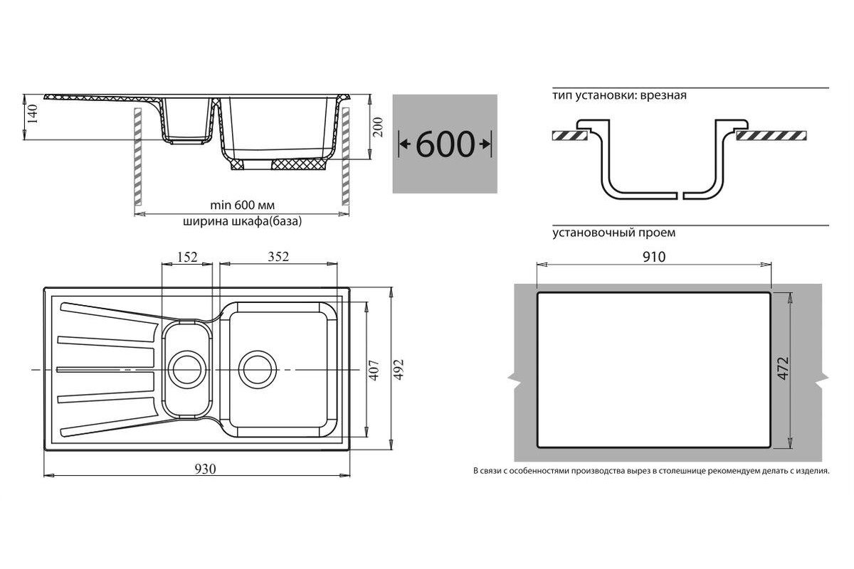 Мойка кухонная GRANFEST STANDART GF-S--940KL черный мрамор 1.5 чаши+крыло 940х495мм