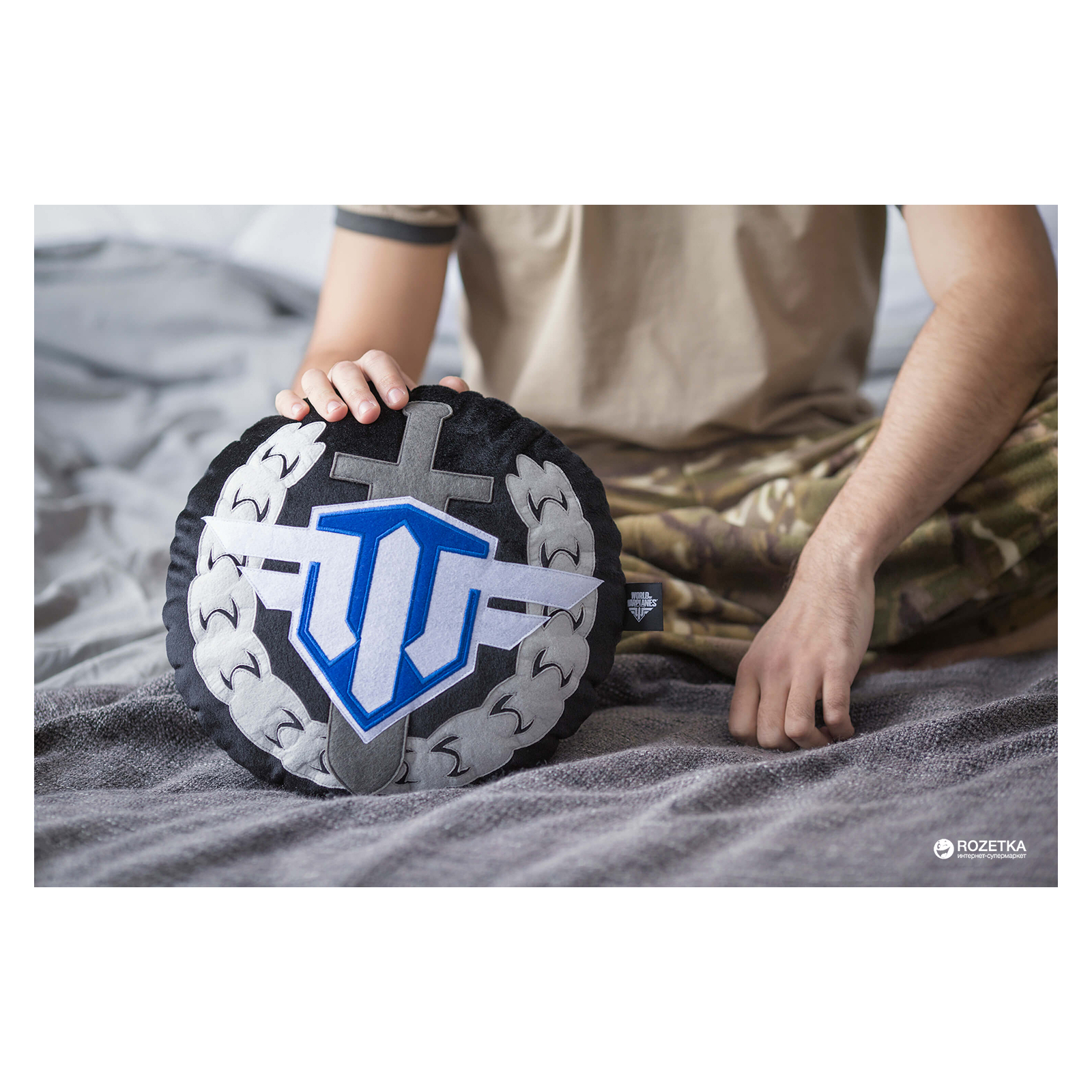 Оригінальний подарунок для шанувальників гри World of Warplanes — декоративна подушка з логотипом гри World of Warplanes , круглої форми, діаметр подушки 31 см. На лицьовому боці подушки аплікація сірого вінка, темно-сірого меча та логотипу гри World of Warplanes.