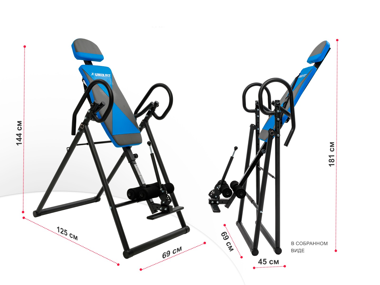 Компактность – тренажер имеет складную конструкцию. Размеры стола в рабочем состоянии 125 х 69 х 144 см, в размеры в собранном виде 45 х 69 х 181 см.