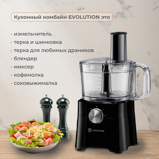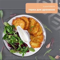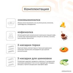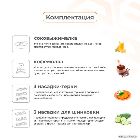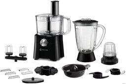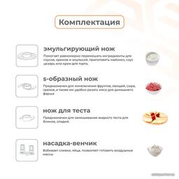 Полная комплектацияоснование комбайна с электродвигателем; чаша комбайна с крышкой;толкатель;съемная втулка;стеклянный блендер;диск-основание для сменных насадок; основание-втулка для крепления ножей; s-образный нож с чехлами для безопасного хранения; нож для теста;насадка-измельчитель; насадка для смешивания;эмульгатор;насадка для взбивания (2 венчика); 6 металлических съемных насадок: насадки для шинковки (1 мм и 2 мм),мелкая терка, крупная терка, терка для драников, насадка для картофеля фри, соковыжималка для цитрусовых;поддон-решетка; стеклянная кофемолка;руководство по эксплуатации