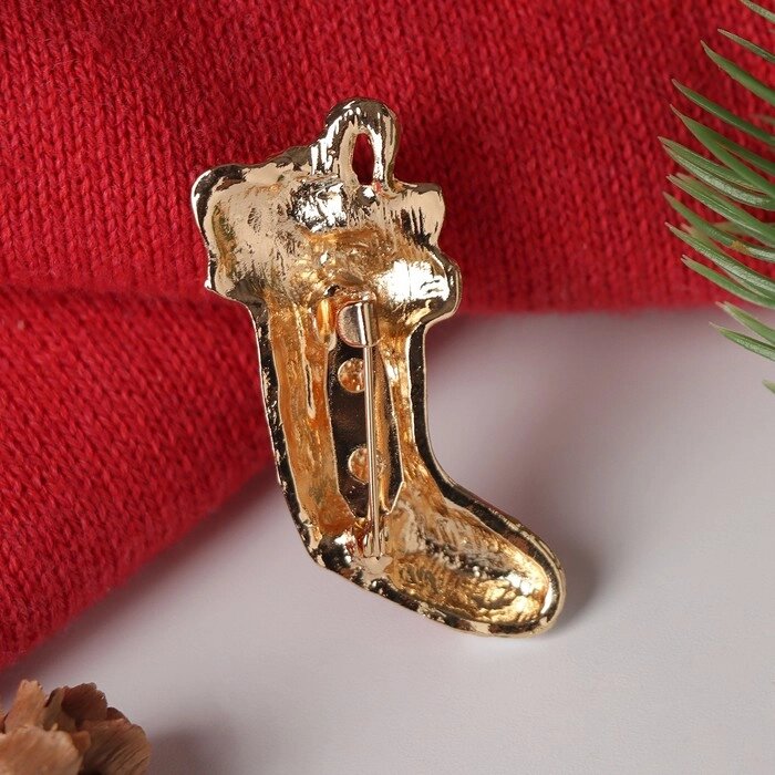 Брошь новогодняя "Носочек" с подарками, цветная в золоте