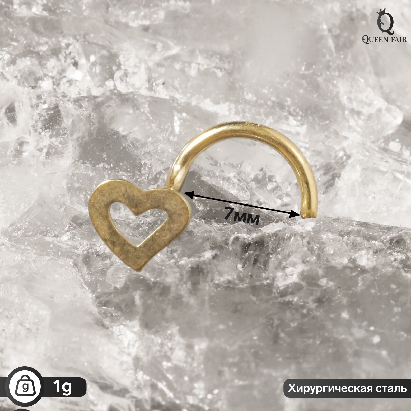Пирсинг в нос (нострил) "Сердце", L=7мм, цвет золото