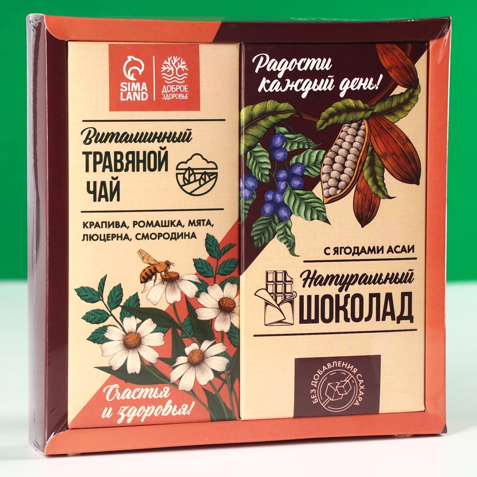 Подарочный набор «Счастья и здоровья»: чай травяной 50 г.,молочный шоколад с кусочками малины и ягодами асаи, БЕЗ САХАРА, 65 г.