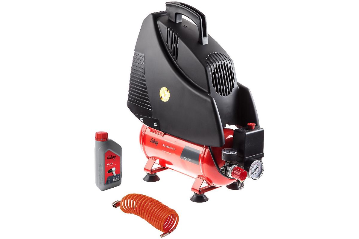 В состав набора входят: Компрессор FUBAG OL 195/6 CM1.5 поршневой безмасляный, 1100 Вт, 180л/мин, 8бар, Масло компрессорное FUBAG VG 46 838271 для пневмоинструмента 1литр, Шланг FUBAG 170024 с фитингами рапид нейлон 10бар 6x8мм 10м