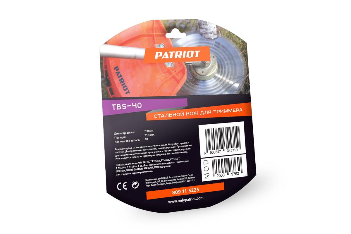 Нож PATRIOT TBS-40 D=230х25.4мм толщина1.3мм 40 зубьев Арт. 809115225 Пильный диск для триммера с твердосплавными зубцами, D=230*25,4 мм, 40 твердосплавных зубьев