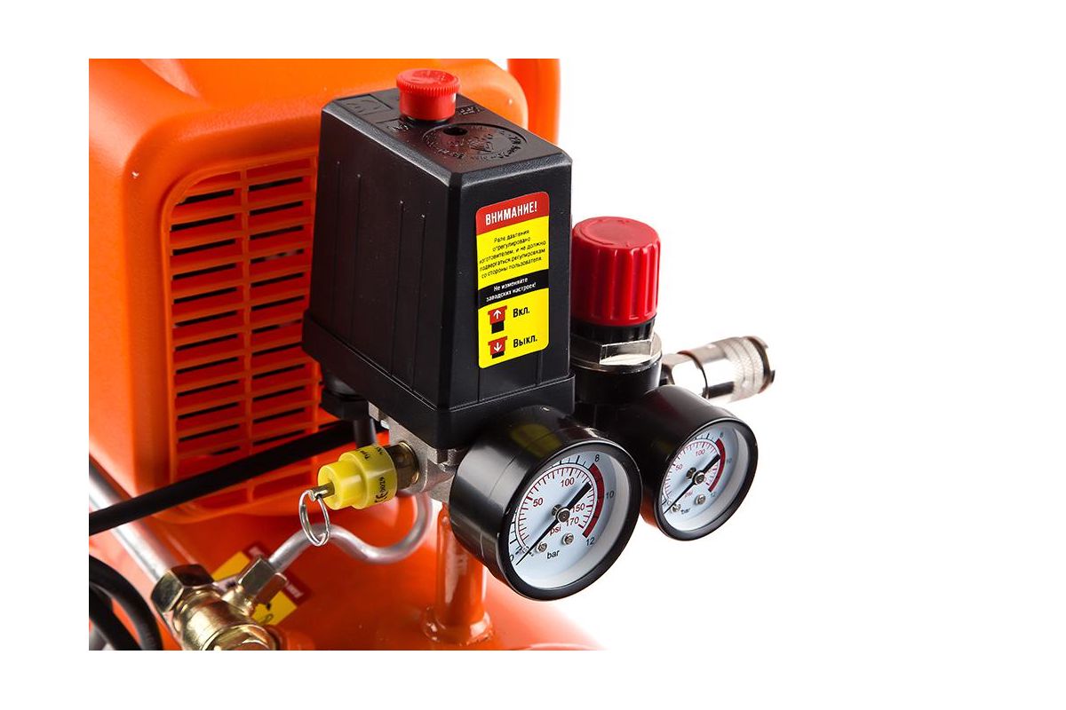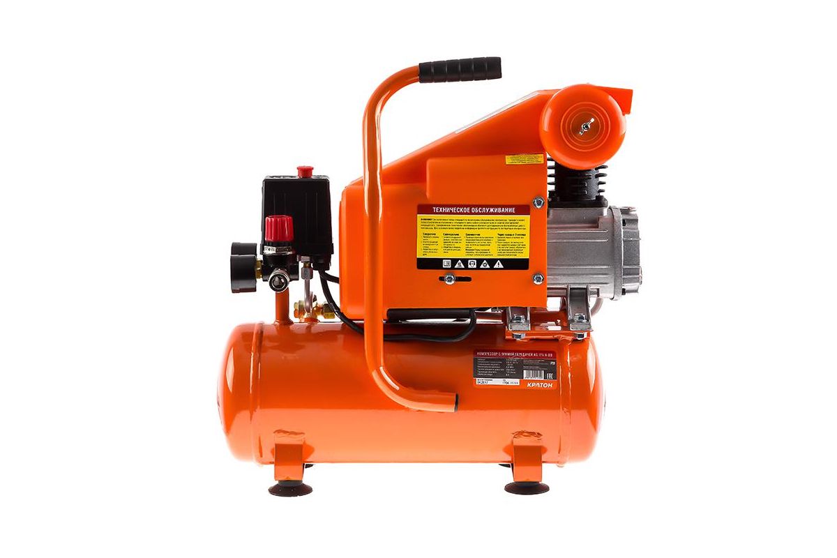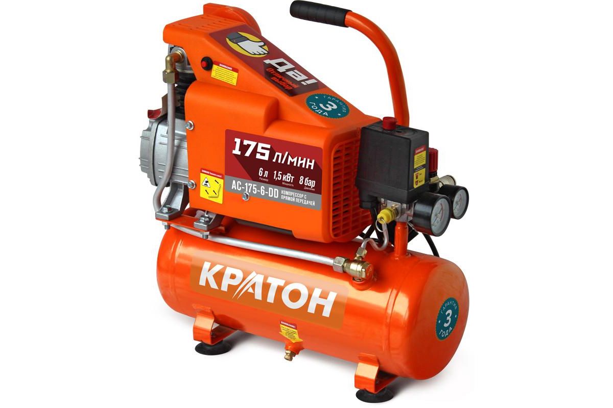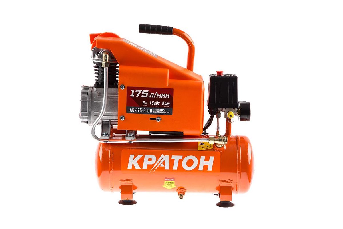 КРАТОН AC-175-6-DD – поршневой компрессор с прямой передачей. Двигатель мощностью 1500 Вт обеспечивает воздушный поток до 175 л/мин. Этого достаточно для подкачки колес или легких работ с аэрографом, маленьким краскопультом (для глобальной покраски и подключения пневмоинструмента не подойдет из-за маленького ресивера).