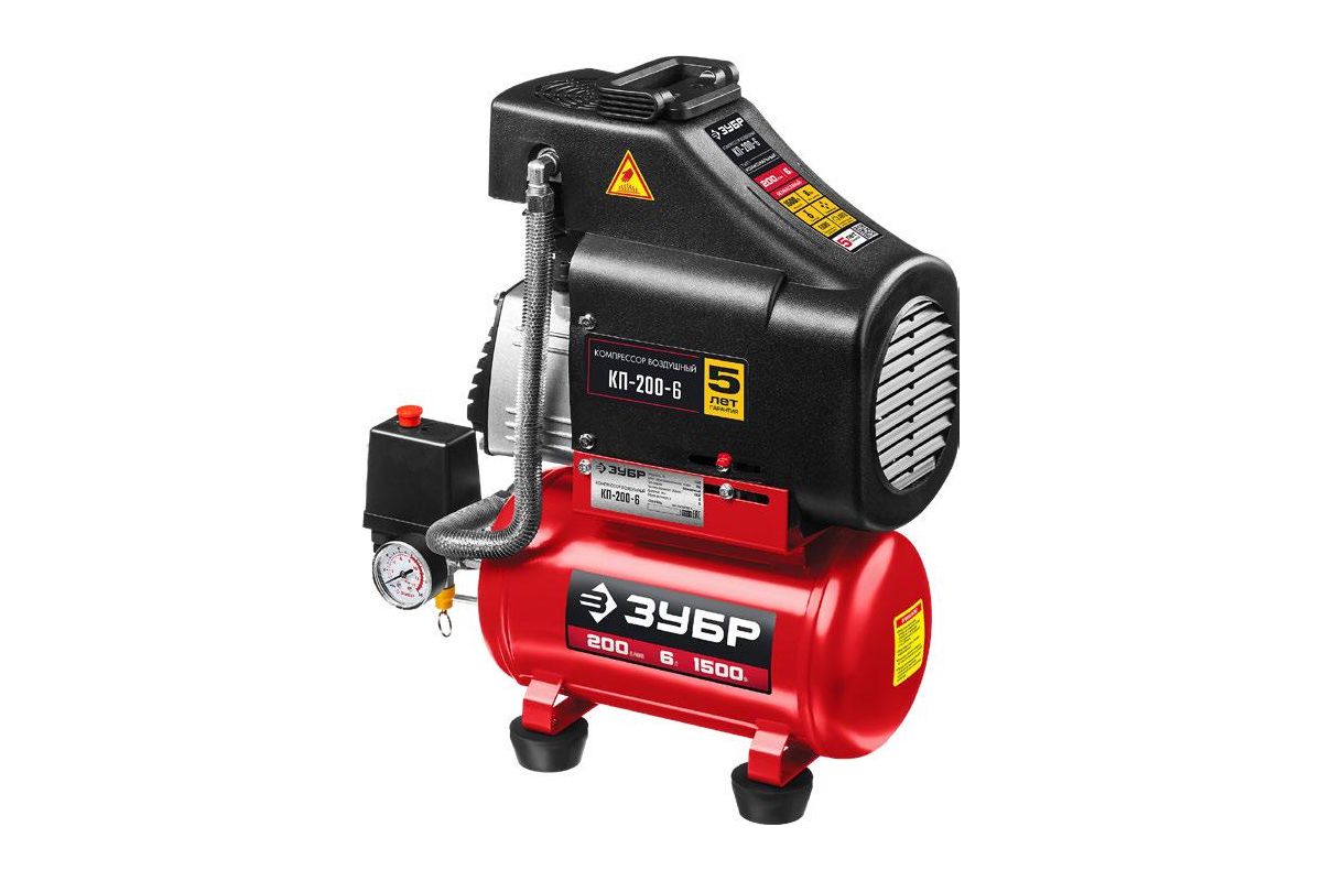- Воздушный безмасляный компрессор ЗУБР с набором аксессуаров, 200 л/мин, 6 л, 1500 Вт, КП-200-6 Н6 вырабатывает чистый, без примесей масла, воздух на выходе;