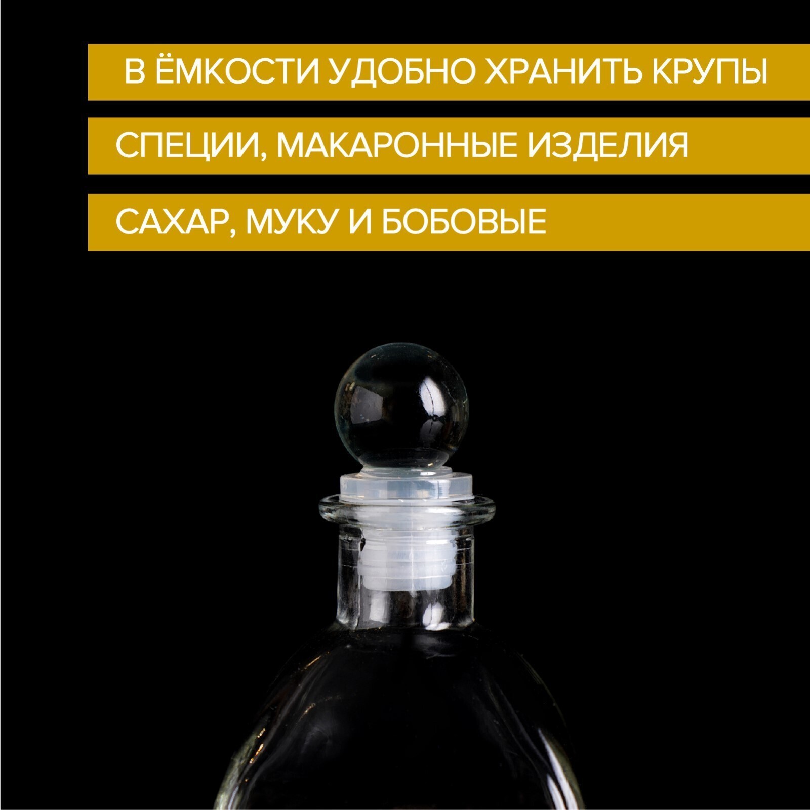 Банка для сыпучих продуктов изготовлена из стекла. Имеет плотно закрывающуюся крышку, которая защищает продукты от влаги и посторонних запахов. В ёмкости удобно хранить крупы, специи, макаронные изделия, сахар, муку и бобовые.