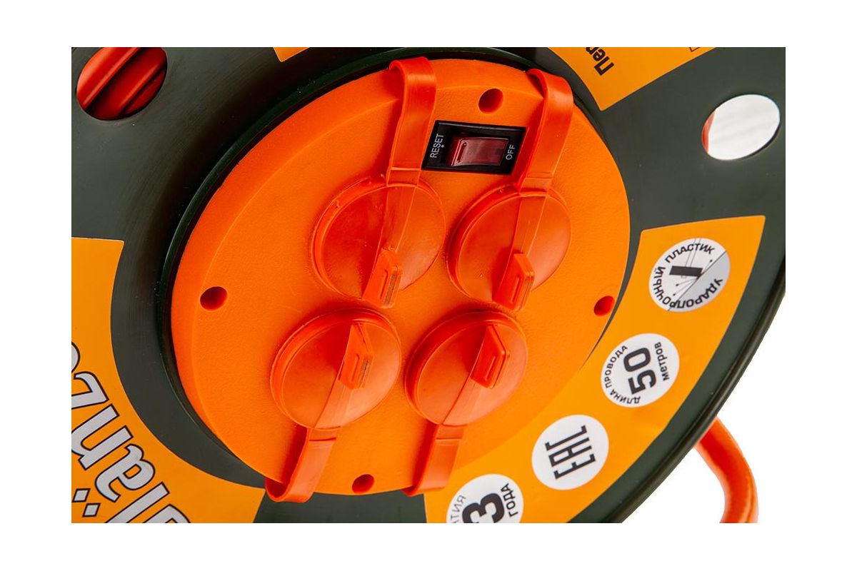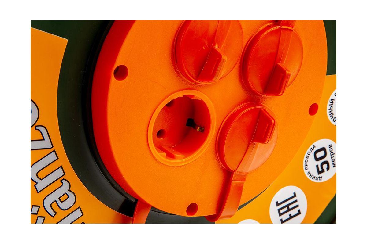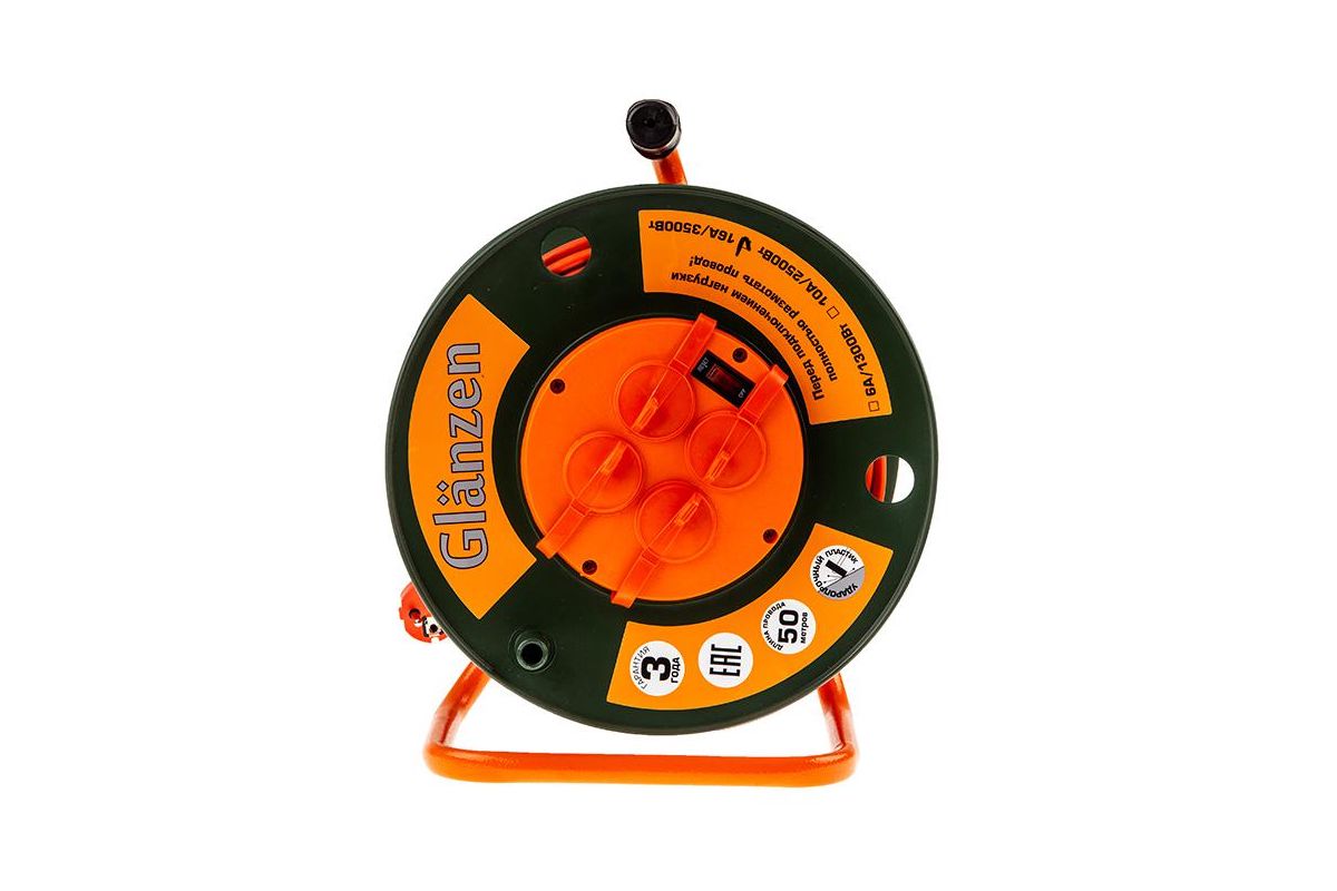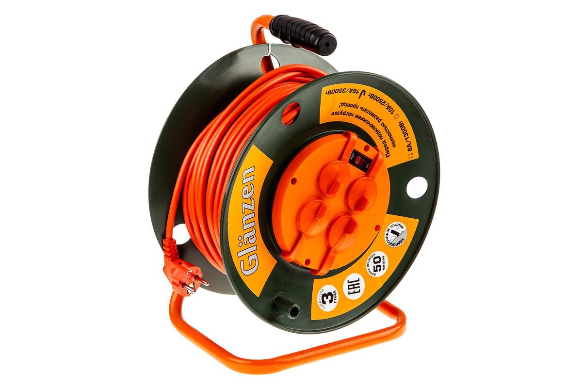 Удлинитель на катушке GLANZEN ЕВ-50-007 50м 3х1,5мм 16А 3500Вт, 4 розетки