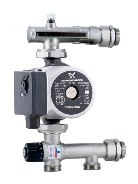 Смесительный узел теплого пола подключаемый к распределительному коллектору гребенке является основной частью для быстрого создания комфортных систем отопления нагревом теплого пола нагретой жидкостью. Смесительный узел Barberi арт. 27B040N4M3 представляет собой уже подготовленный для установки в систему комплект элементов состоящий из термостатического трехходового клапана, термометра, развоздушника и элементов для подключения узла к системе отопления и коллектору и насоса циркуляции теплоносителя. Особенностью этой модели является возможность изменить межосевое расстояние подключений к коллектору за счет наличия эксцентриков.