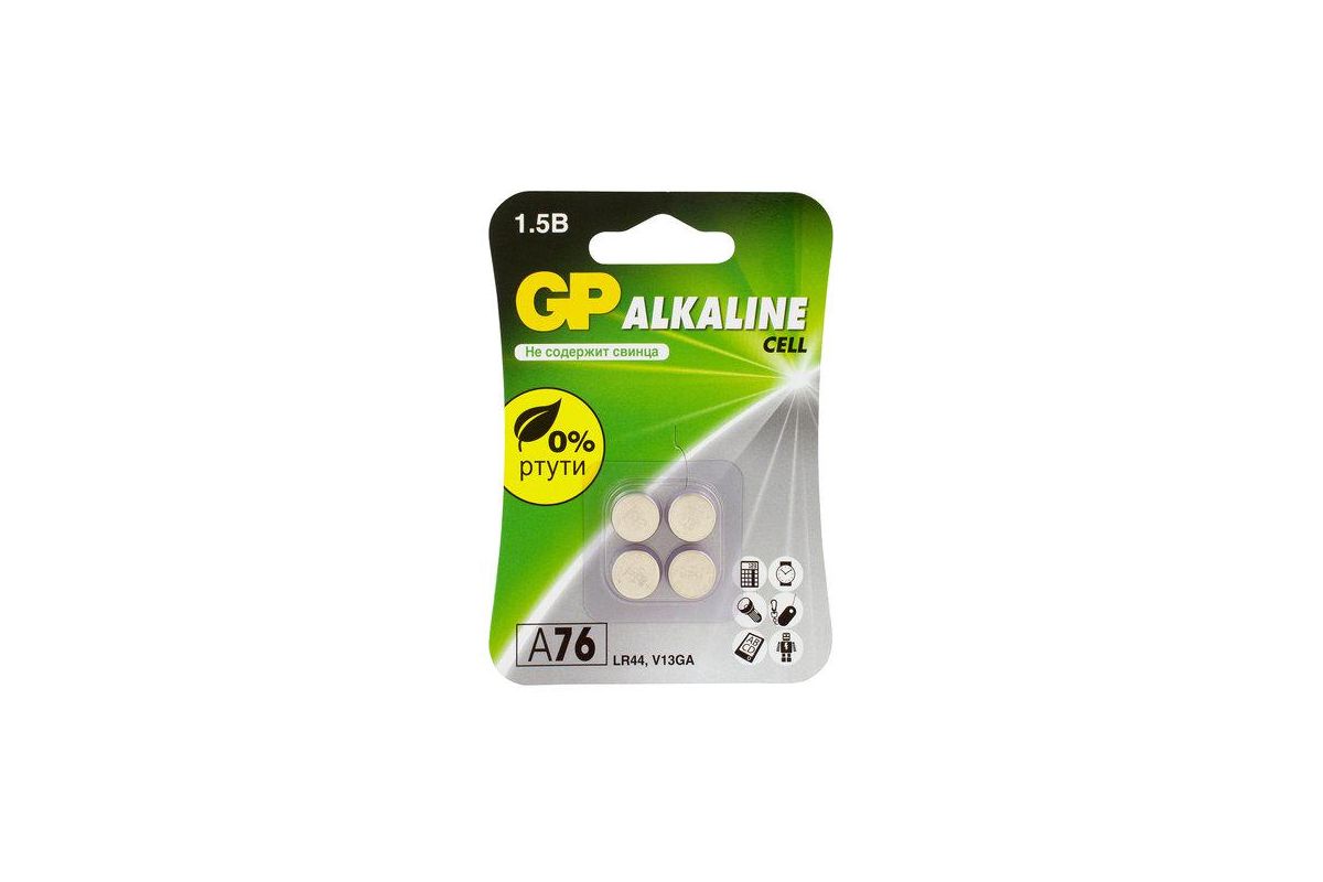 Алкалиновые пуговичные батарейки GP A76 (GPA76F-2CRU4) 4шт в блистере Напряжение: 1,5 В; Номинальная емкость: 110 мАч Аналоги: LR44, G13, V13GA, A76 4 шт. на блистере