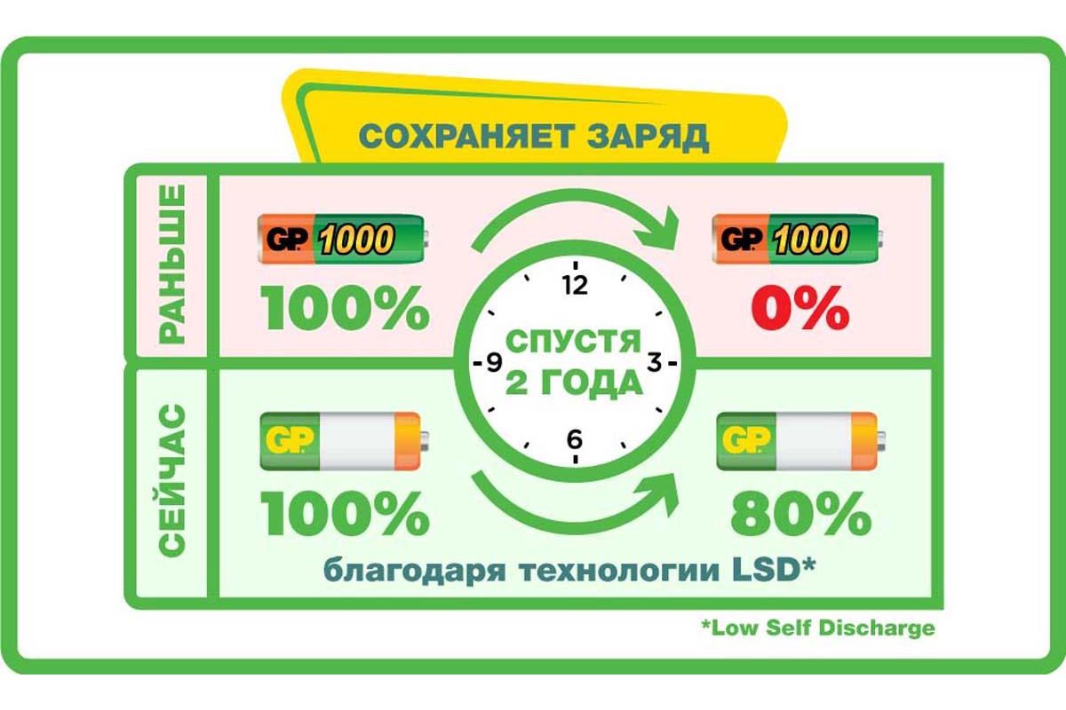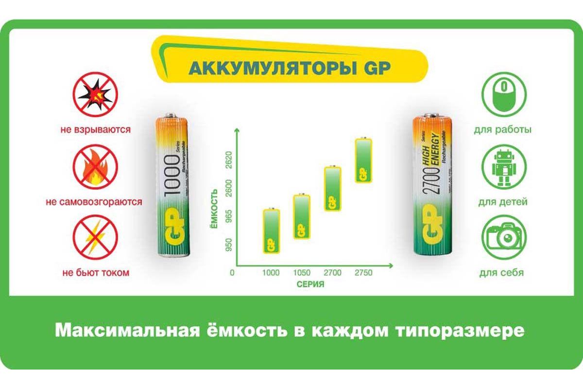 Аккумулятор NiMH 2700 мАч GP подходит для цифровых фотоаппаратов, плееров, детских игрушек и т.д. Для никель-металлгидридных аккумуляторов характерна наибольшая энергетическая емкость среди всего разнообразия аккумуляторных батарей. Батарейки сохраняют заряд, даже если не используются в течение длительного времени. Батарейки имеют долгий срок службы и могут перезаряжаться до 500 раз, в зависимости от условий эксплуатации. Аккумулятор можно эксплуатировать при температуре от -20 до +50 °С
