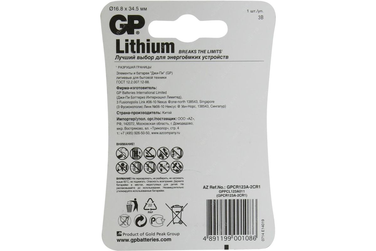 Литиевая батарейка GP CR123A 3В (CR123A-2CR110/450) 1шт в блистере