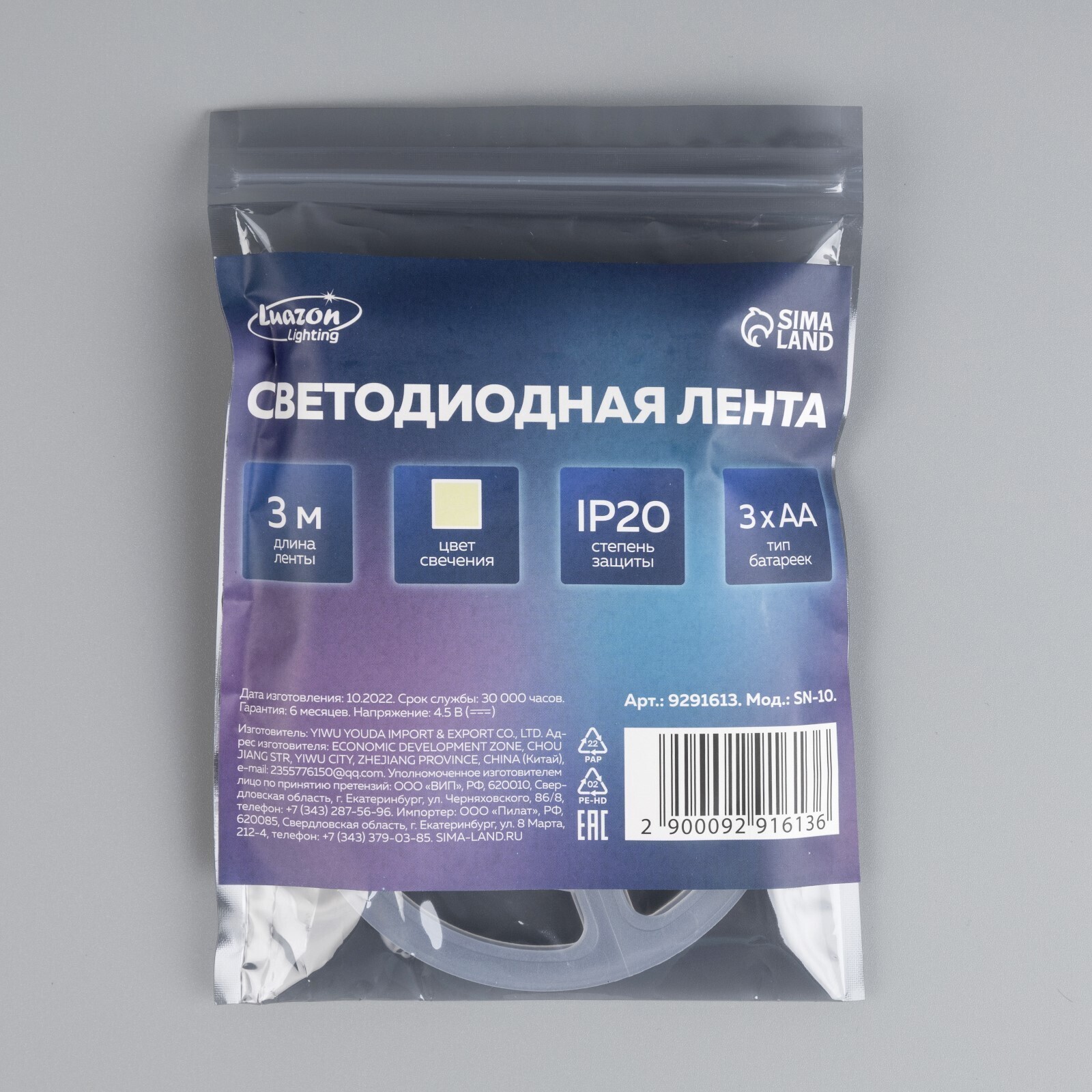Светодиодная лента Luazon Lighting 3 м, IP20, SMD2835, 30 LED/м, 3хААА, 3000К