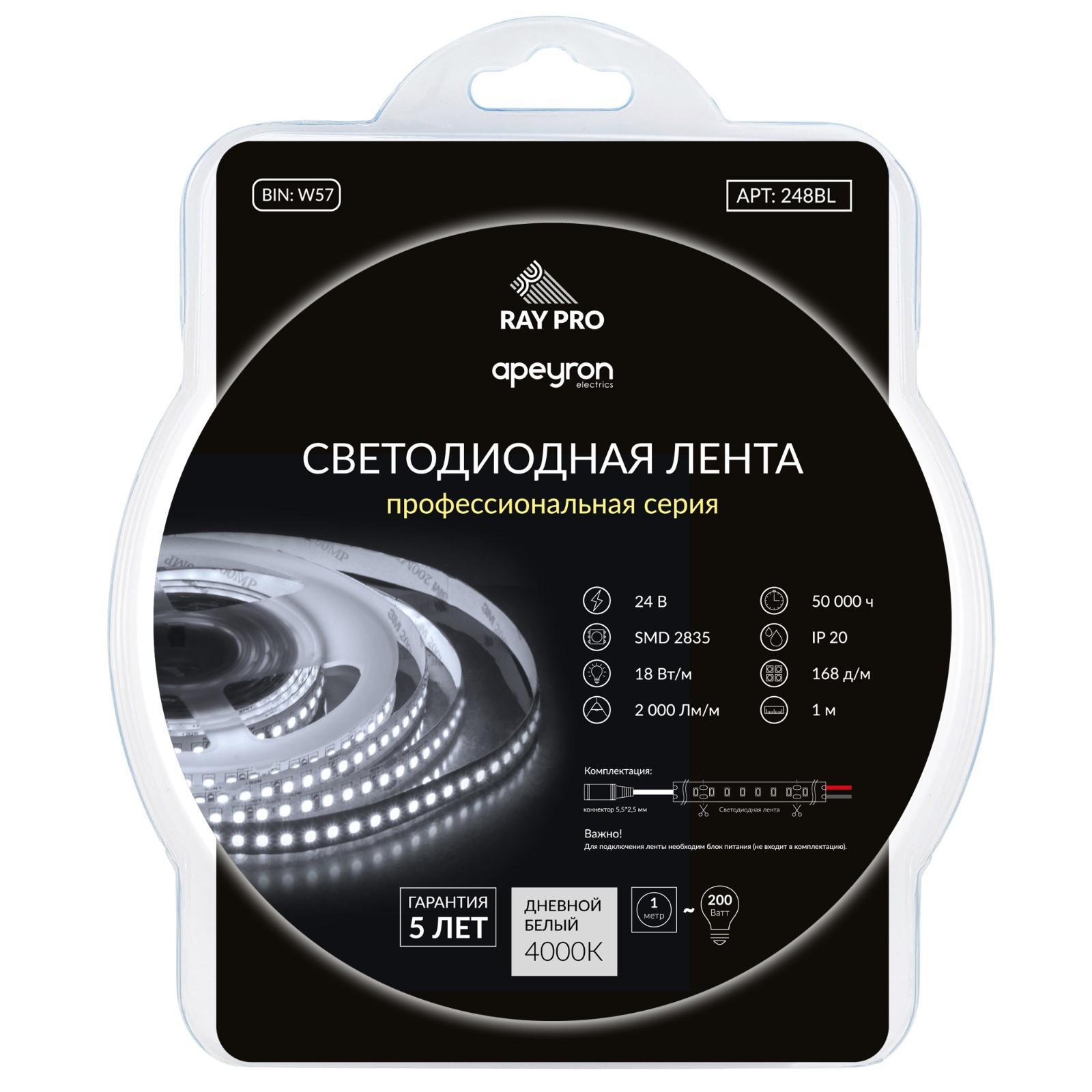 Светодиодная лента Apeyron Electrics 1 м, IP20, SMD2835, 168 LED/м, 18 Вт/м, 24 В, 4000К
