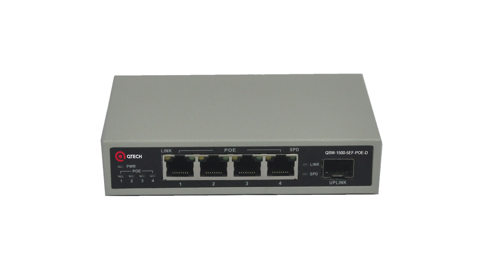 Неуправляемый коммутатор уровня L2 с поддержкой PoE 802.3af/at, 4 порта 10/100BASE-T, 1 порт 100BASE-X SFP, 1K MAC адресов, встроенный БП, 220В AC, размеры ШхГхВ (191x141x64 мм) QTECH QSW-1500-5EF-POE-D