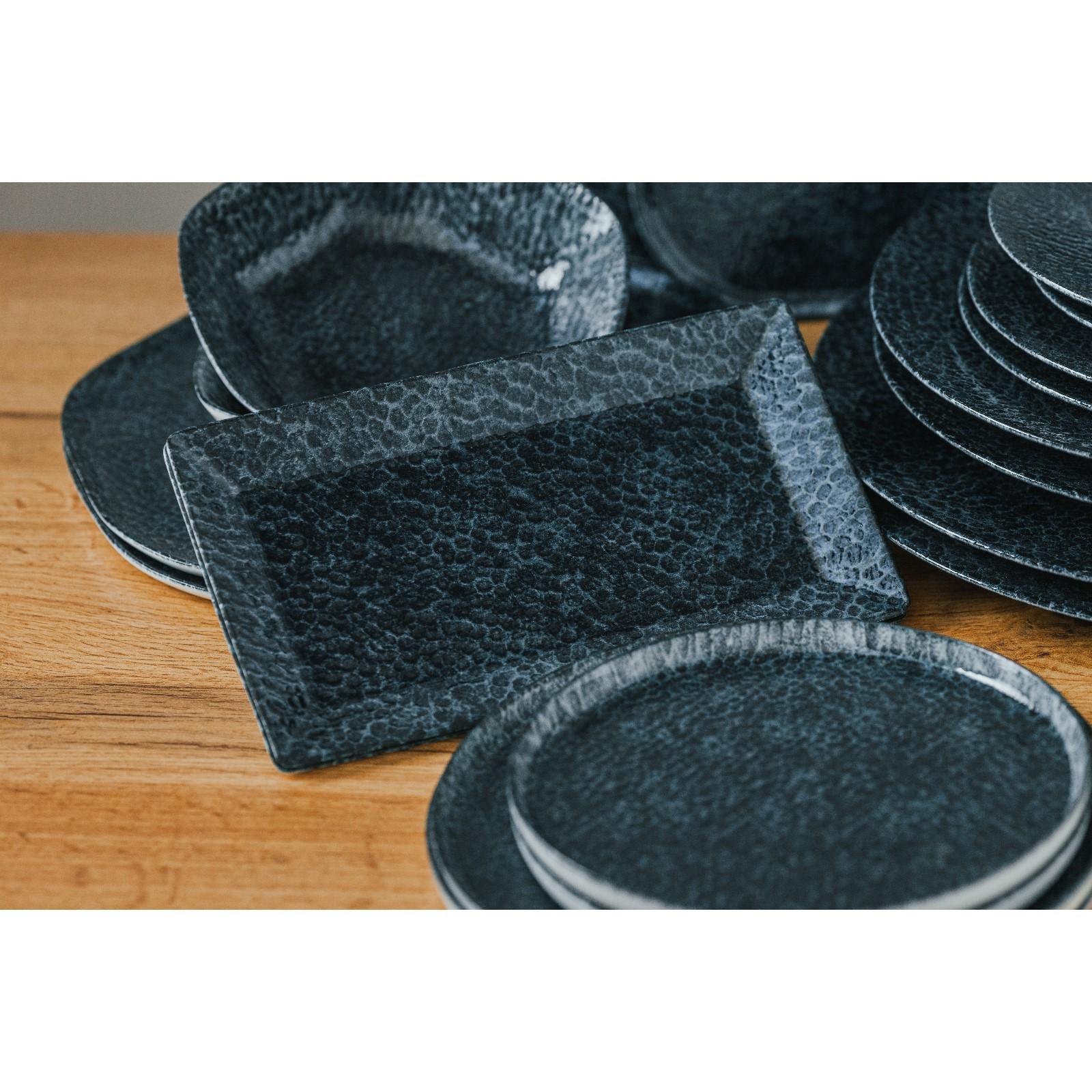Посуда коллекции Moss имеет гладкую поверхность с маленькими ямочками, похожими на лунные кратеры. У изделий очень тонкие стенки, материал напоминает костяной фарфор, тарелки очень лёгкие и элегантные.