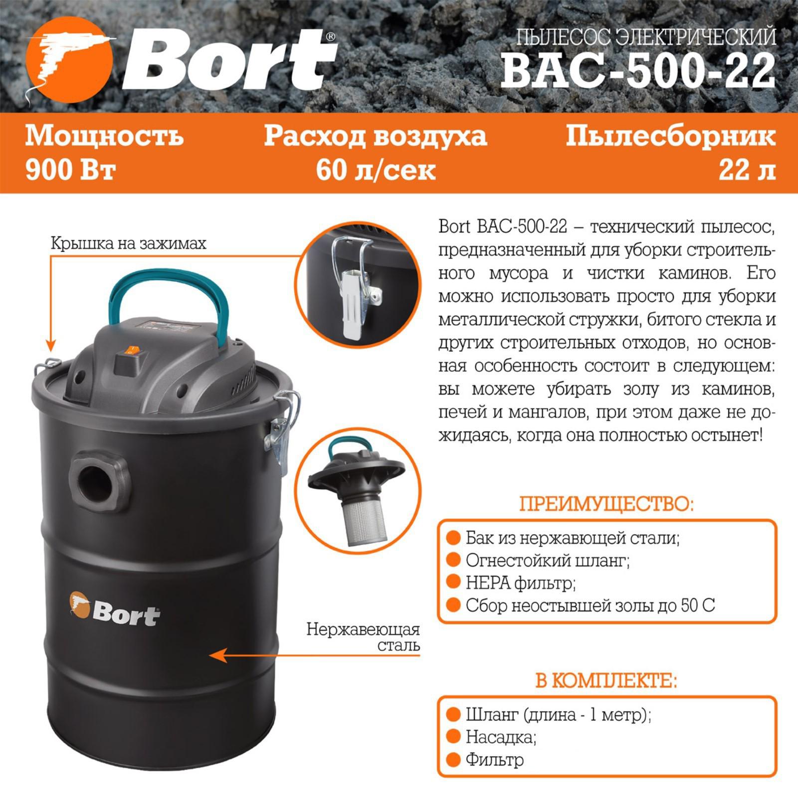 Строительный пылесос Bort BAC-500-22, 900 Вт, 60 л/сек, 22 л, шланг 1 м