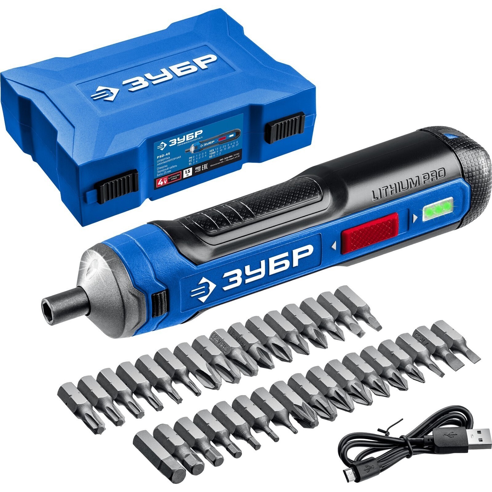 Отвертка аккумуляторная ЗУБР PSD-4S, в кейсе с набором 33 бит, 4 Vmax