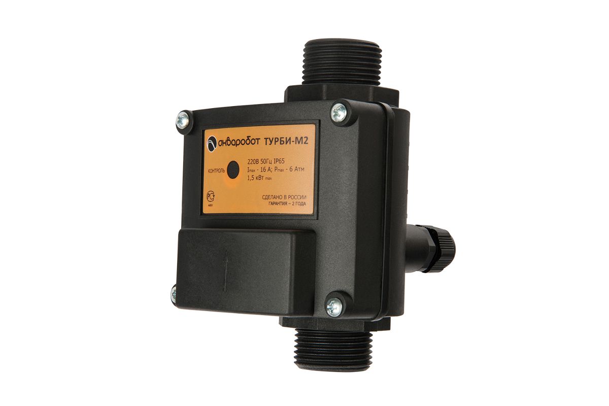 Блок «АКВАРОБОТ ТУРБИ М2» предназначен для управления насосом по потоку и по двум порогам давления. Пороги давления Рмин и Рмакс в «АКВАРОБОТ ТУРБИ М2» определяются типом датчика давления.