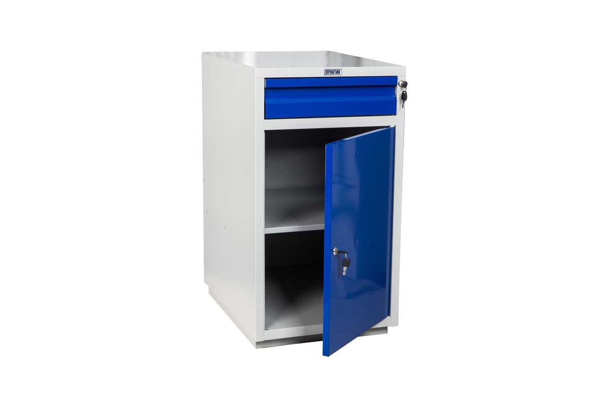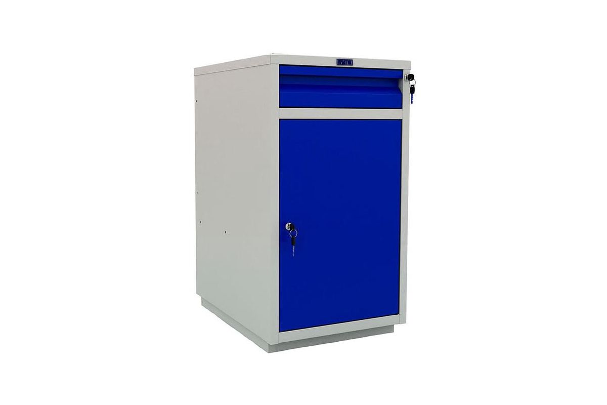 Тумба для верстака серии ''W'' комплектуется 2-мя съемными регулируемыми полками. габариты ШХВХГ, мм: 460х840х640 Нагрузка на полку 30 кг. Возможность смены стороны открывания двери. Ключевой замок Практик. Выдвижной ящик оборудован телескопическими направляющими и ключевым замком Практик. Нагрузка на ящик 30кг. Цвет: корпус RAL 7038, дверь и лицевая панель ящика RAL 5002.