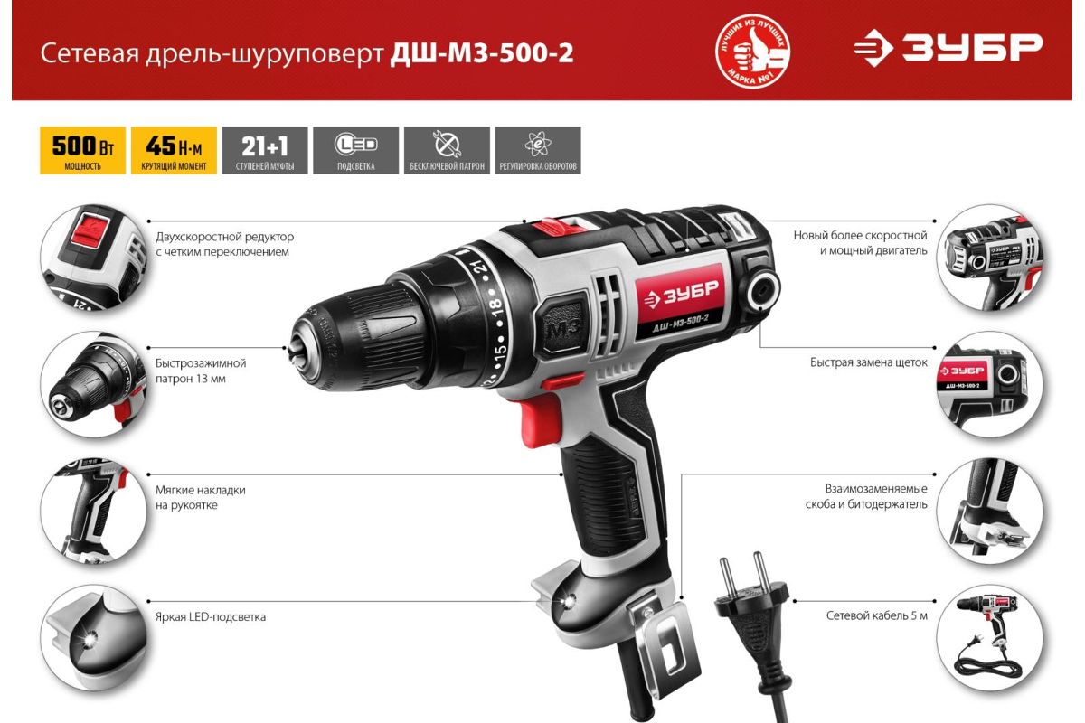 Дрель-шуруповерт сетевая ЗУБР ДШ-М3-500-2 500 Вт, 0-450/0-1800 об/мин