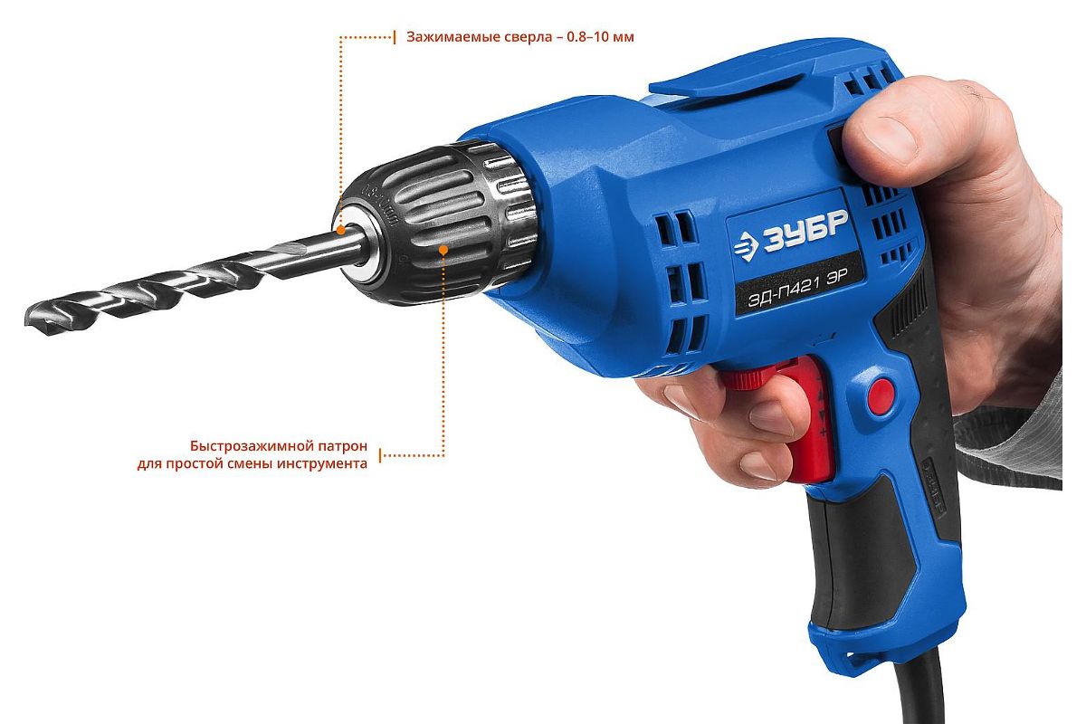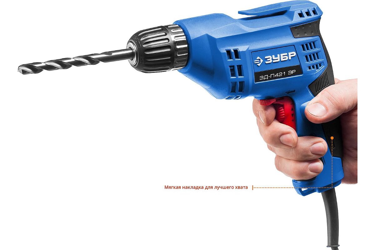 Дрель ЗУБР ПРОФЕССИОНАЛ ЗД-П421 ЭР обладает надежной конструкцией. Применяется для точного сверления отверстий в различных материалах. Также имеется возможность заворачивания крепежных изделий при установке соответствующей оснастки. Быстрозажимной патрон позволяет легко и быстро менять аксессуары. Фиксация выключателя во включенном положении обеспечивает удобство при продолжительной работе. Предусмотрена регулировка оборотов - от малых (для аккуратного засверливания) до высоких (для быстрого сверления).