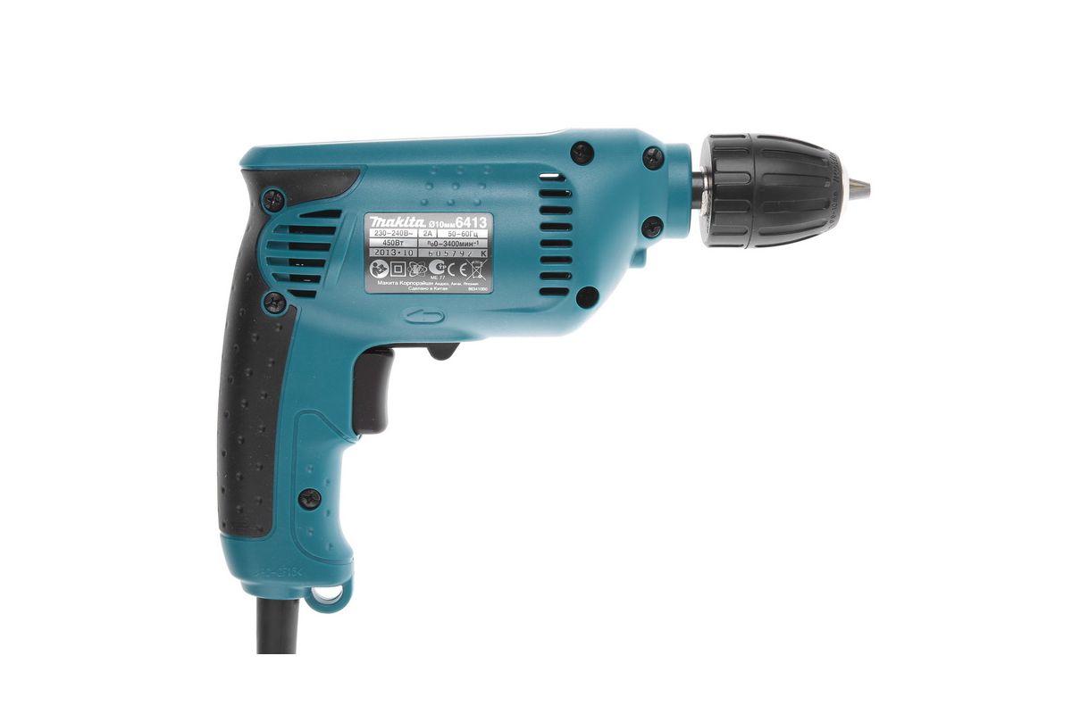 К очевидным преимуществам сетевой дрели Makita 6413 можно отнести небольшой вес и размер. Весит эта дрель чуть больше килограмма, а компактная конструкция дрели позволяет работать с этим инструментом одной рукой и в любом положении, в том числе без труда выполнять потолочные работы и сверлить отверстия в узких местах и ограниченных пространствах. Дрель Makita 6413 может использоваться для сверления отверстий диаметром до 10 мм в металле и 25 мм в дереве. Сетевые дрели такого плана на протяжении многих лет успешно применяются профессионалами, задействованными в различных областях, для проделывания базовых отверстий, как под клепальные гайки, так и под самонарезающие винты.