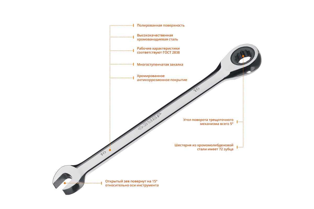 Комбинированный гаечный ключ трещоточный ЗУБР 10 мм Трещоточный механизм Cr-V сталь Хромированное покрытие