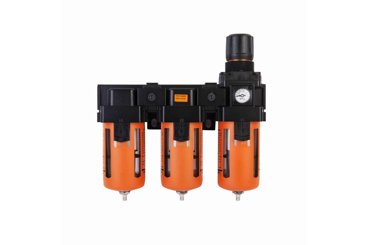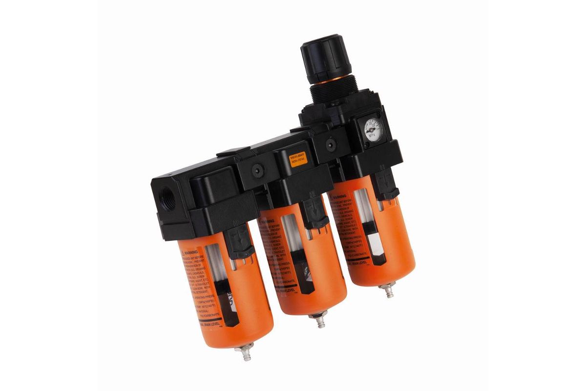 Модульная группа с тремя влаго-маслоотделителями и регулятором давления. Обеспечивает трехступенчатую фильтрацию и сепарирование сжатого воздуха, используя фильтрующие элементы различной степени очистки. Фильтр-масло/влагоотделитель применяется для очистки сжатого воздуха от механических частиц, воды и минерального масла. Регулятор давления предназначен для контроля и фиксации давления в пневмосистеме. Уровень давления регулируется с помощью вентиля и отображается на встроенном манометре. Скоба-держатель используется при сборке и закреплении блока подготовки воздуха на вертикальной поверхности.