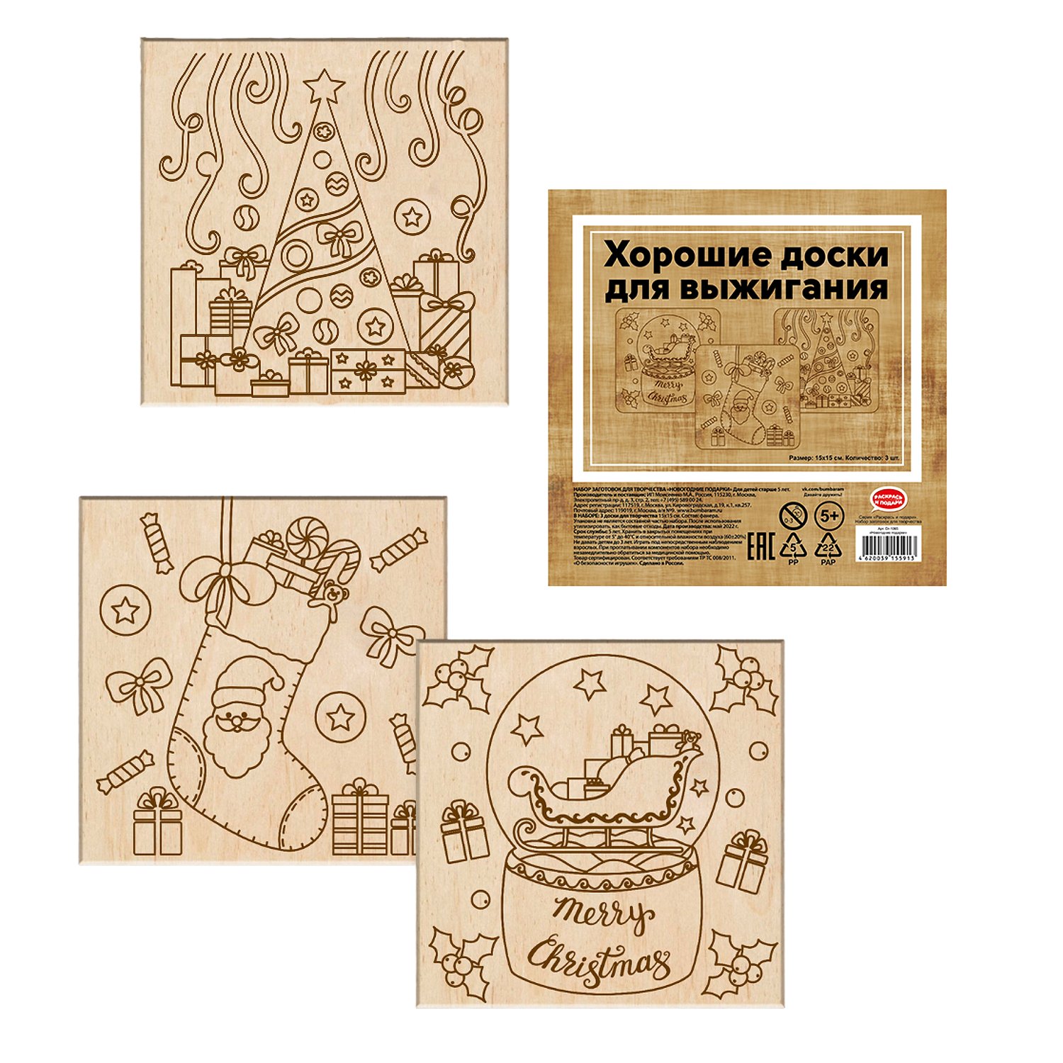 Набор досок для выжигания Раскрась и подари Новогодние подарки 15х15 см 3 шт. DR-1065