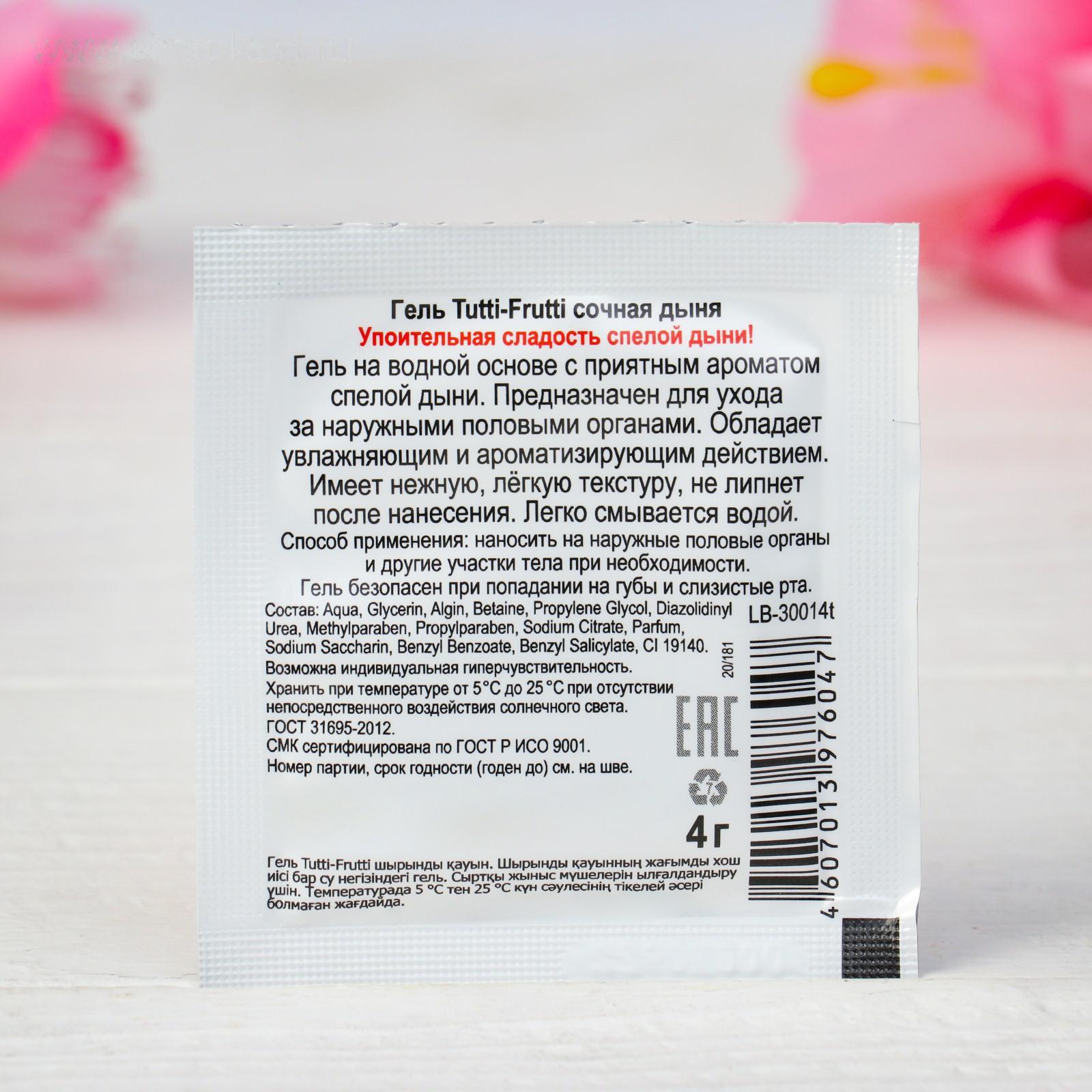 TUTTI-FRUTTI со вкусом сочной дыни — гель-лубрикант, выполненный на водной основе. Имеет сладкий вкус и аромат спелой дыни. Откроет новые грани орального секса и подарит новые эмоции во время любовной игры.