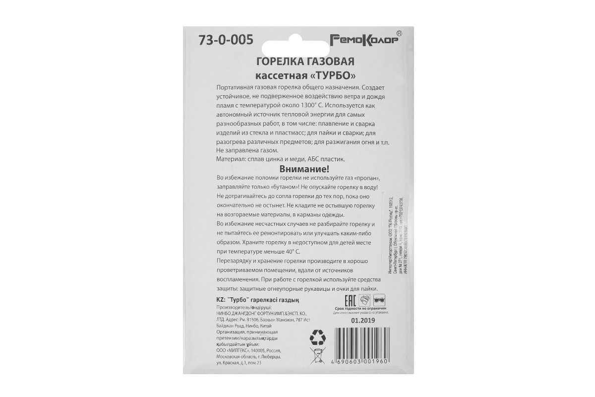 Горелка РЕМОКОЛОР 73-0-005 газовая кассетная ''турбо'' для пайки и сварки заправляется бутаном с4н