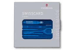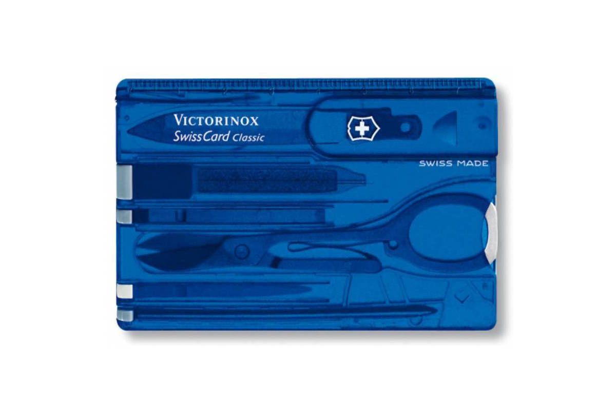 Карманный многофункциональный инструмент швейцарская карточка Victorinox SwissCard Sapphire, синего цвета, в формате кредитной карты. Компактный, плоский корпус легко помещается в бумажнике, барсетке или просто в кармане. Полупрозрачный синий корпус скрывает в себе множество инструментов, которые могут пригодиться в любую минуту. В перечень входят: удобный нож для писем и ножницы, пилка для ногтей и плоская отвертка, линейка и пинцет, а также, булавка, шариковая ручка и зубочистка.