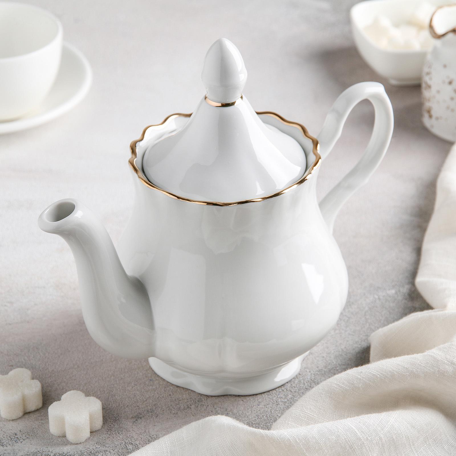 Золотое обрамление белоснежного фарфора – нестареющая классика посудного жанра. Чайник «Романс», 800 мл, цвет белый внесет в привычное окружение нотку изысканной свежести и благородной простоты.
