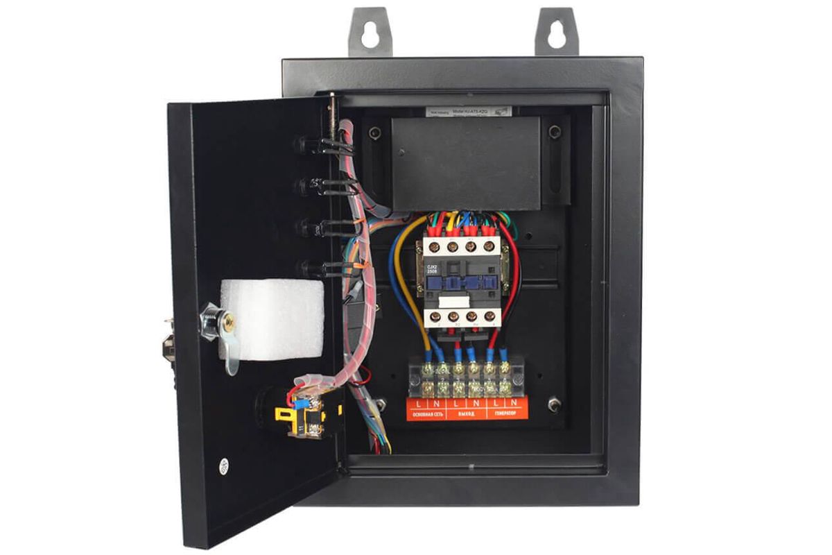 - Переключает силовой контактор на питание потребителей от сети при появлении сетевого напряжения;