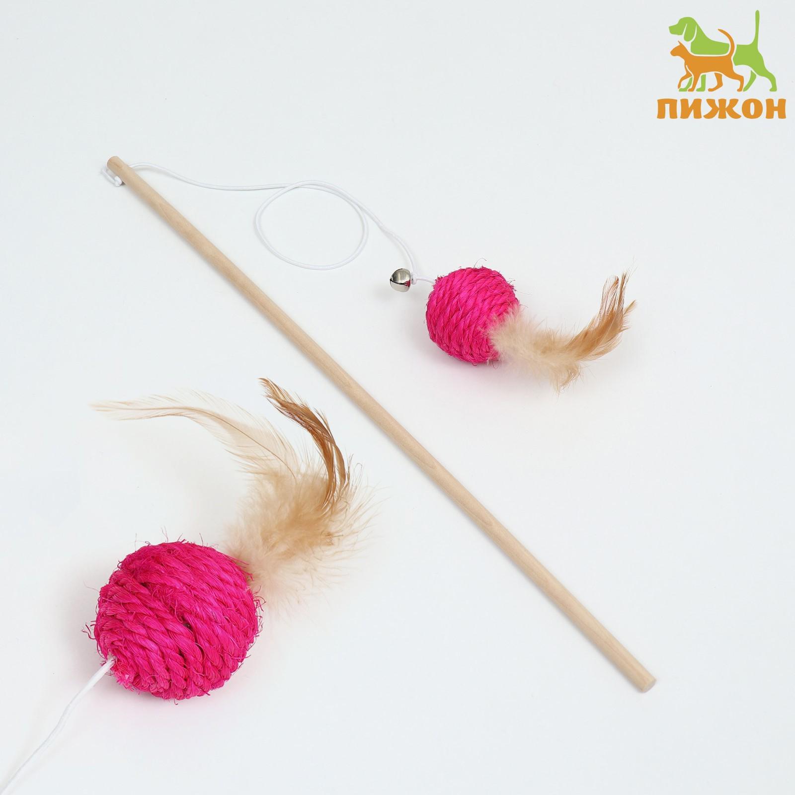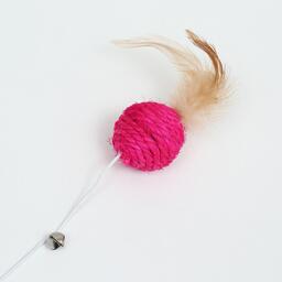Дразнилка "Сизалевый шар" с перьями и бубенчиком, на деревянной ручке, 40 см, розовый шар