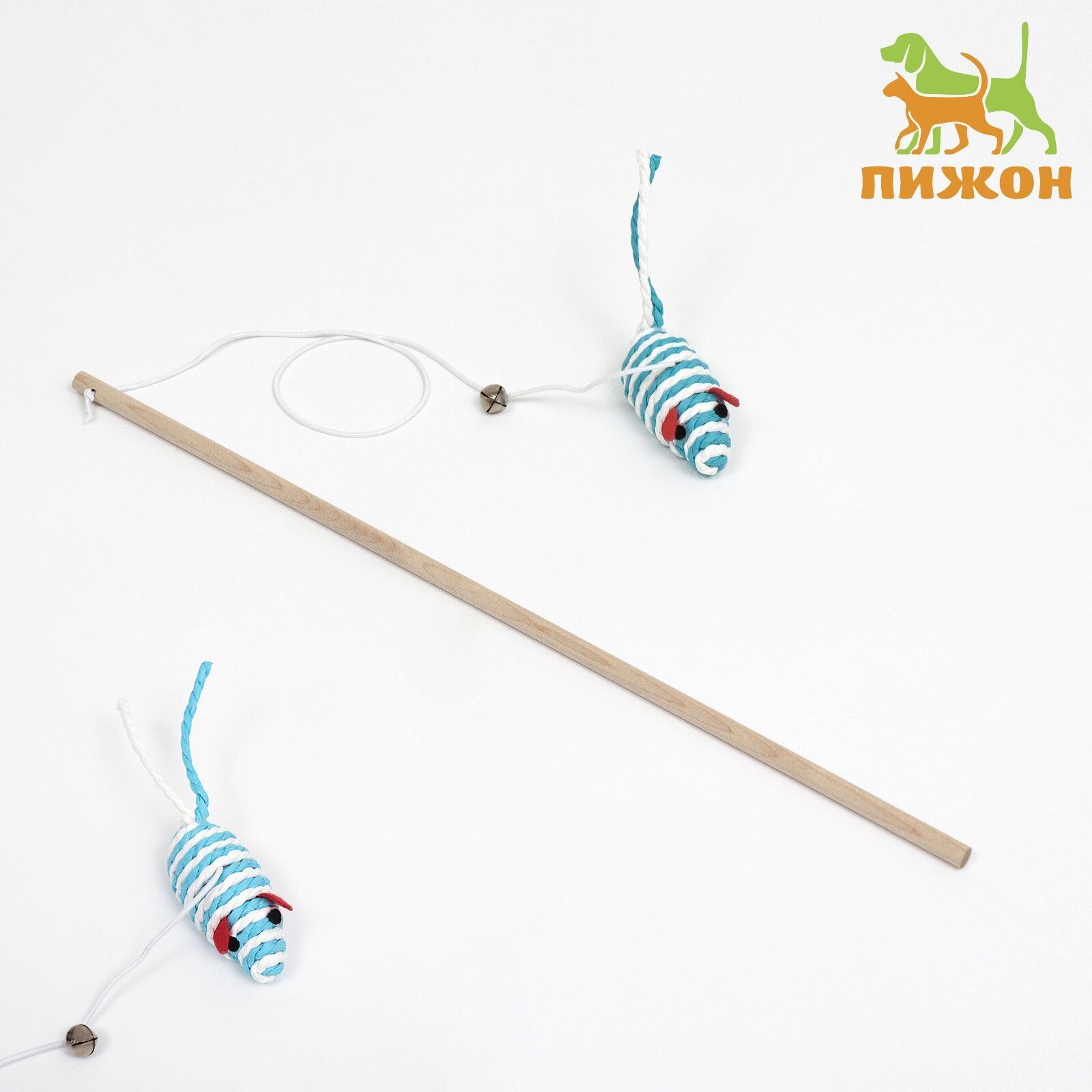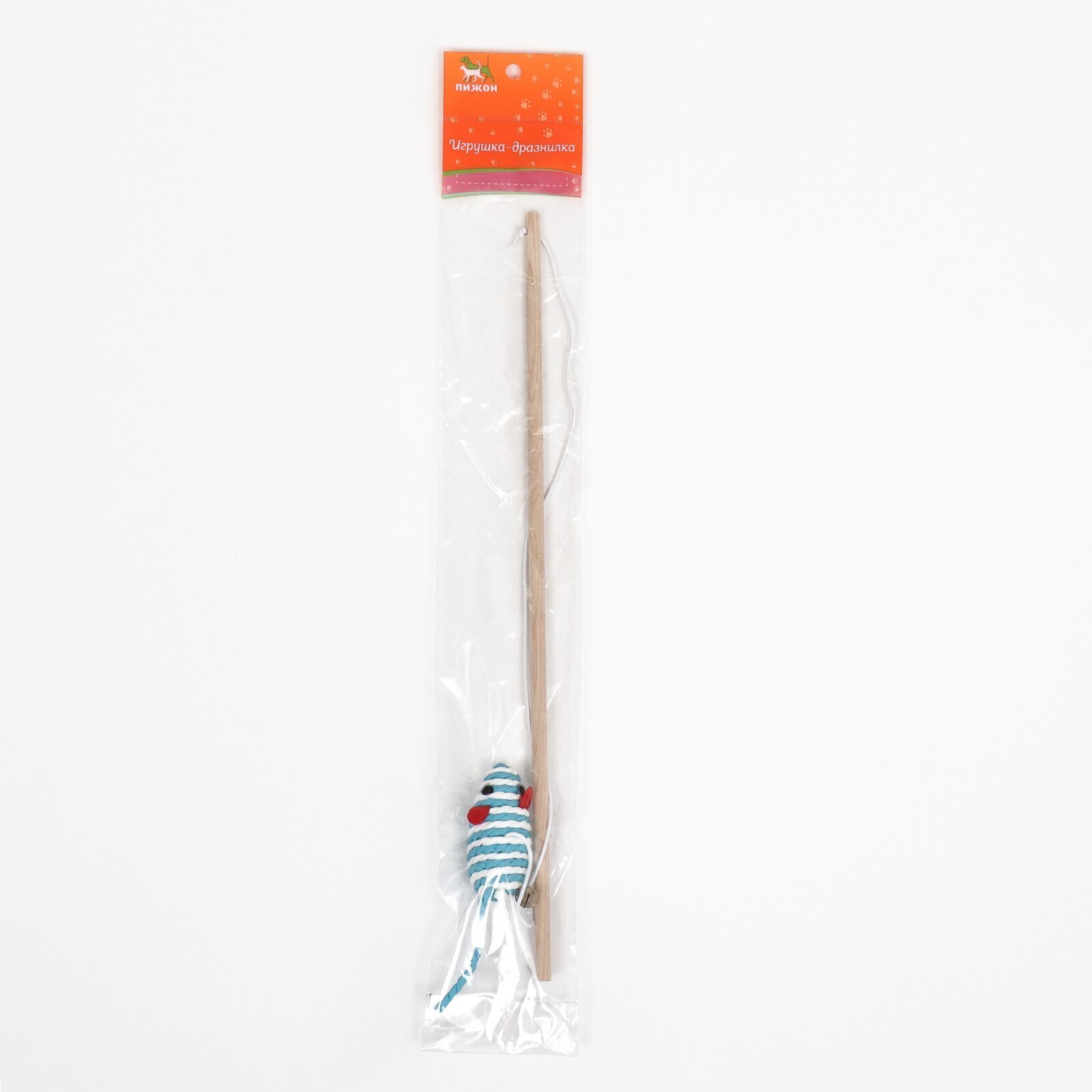 Дразнилка-удочка с мышью на деревянной ручке, голубая/белая