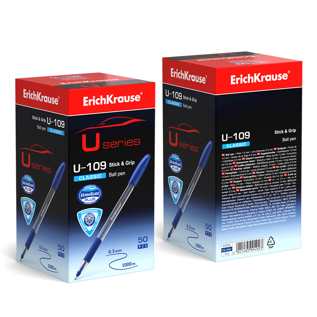 Описание товара 143890, Ручка шариковая масляная с грипом ERICH KRAUSE U-109 Classic, СИНЯЯ, 1,0мм, линия 0,3мм, 47574