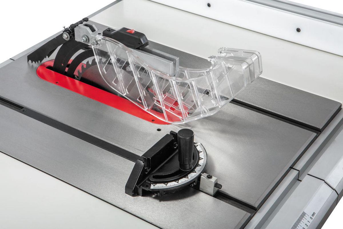 Основа станка – мощный литой из чугуна рабочий стол, к нему прикреплен пильный модуль из этого же материала, содержащий в себе привод диска и механизмы его наклона и погружения. К столу же крепятся стальные из толстого листа расширения слева и справа, а также составные направляющие с миллиметровой разметкой. Они дополнительно скрепляют секции рабочей поверхности и служат базой для параллельного упора. Он оборудован удобным эксцентриковым зажимом с двухсторонней фиксацией и обеспечивает быструю, удобную и жесткую настройку ширины реза. Его можно установить как слева, так и справа от диска, а также снять совсем (для хранения есть кронштейны на корпусе). Для торцевания и распиловки под углом есть транспортирный упор, скользящий по Т-образному пазу (они есть с двух сторон диска).